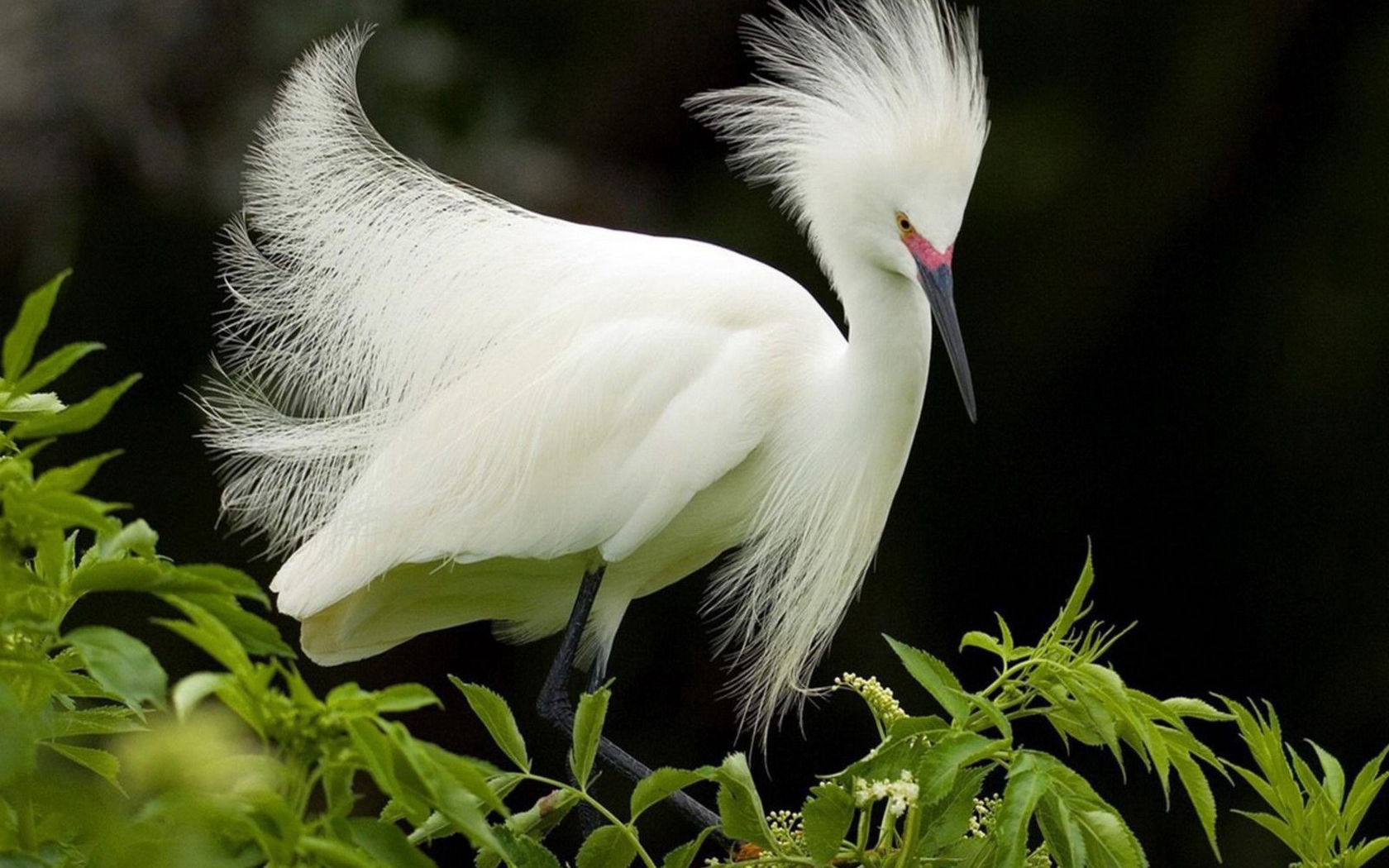 Description: A white bird with a long tail standing on a branch in a tree branch filled with leaves and flowers.