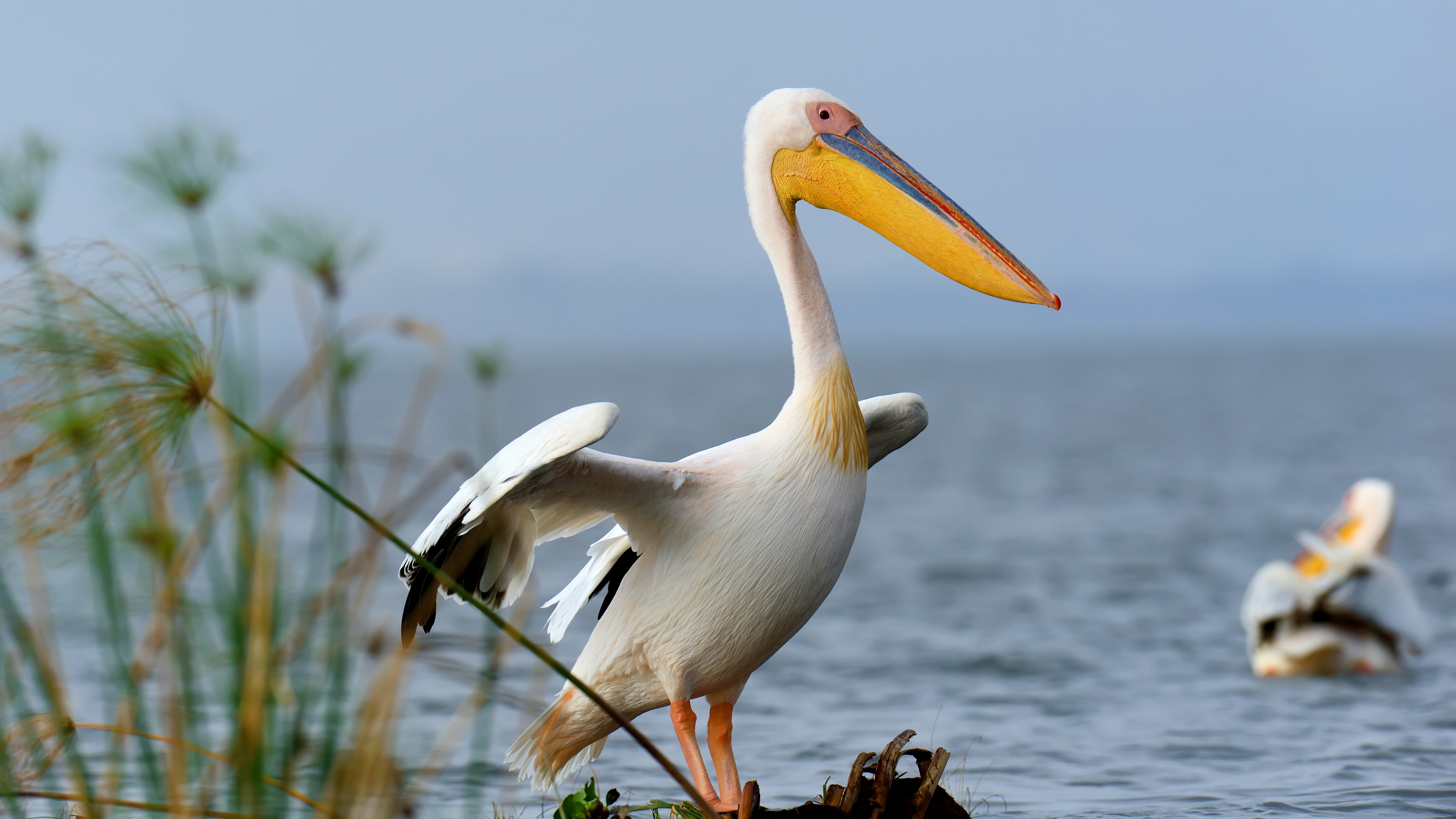 Description: A large white bird standing on top of a tree stump in the water with a large bird in the background.