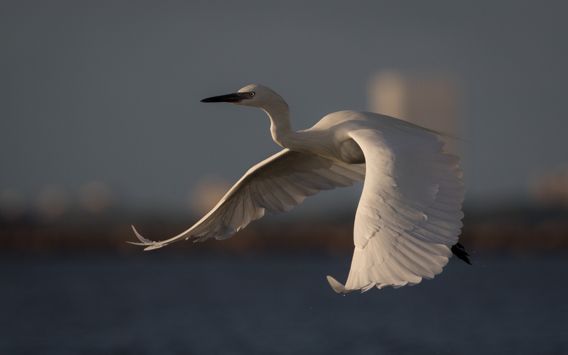 Description: A white bird flying over a body of water with a city in the background on a cloudy day with a few clouds.