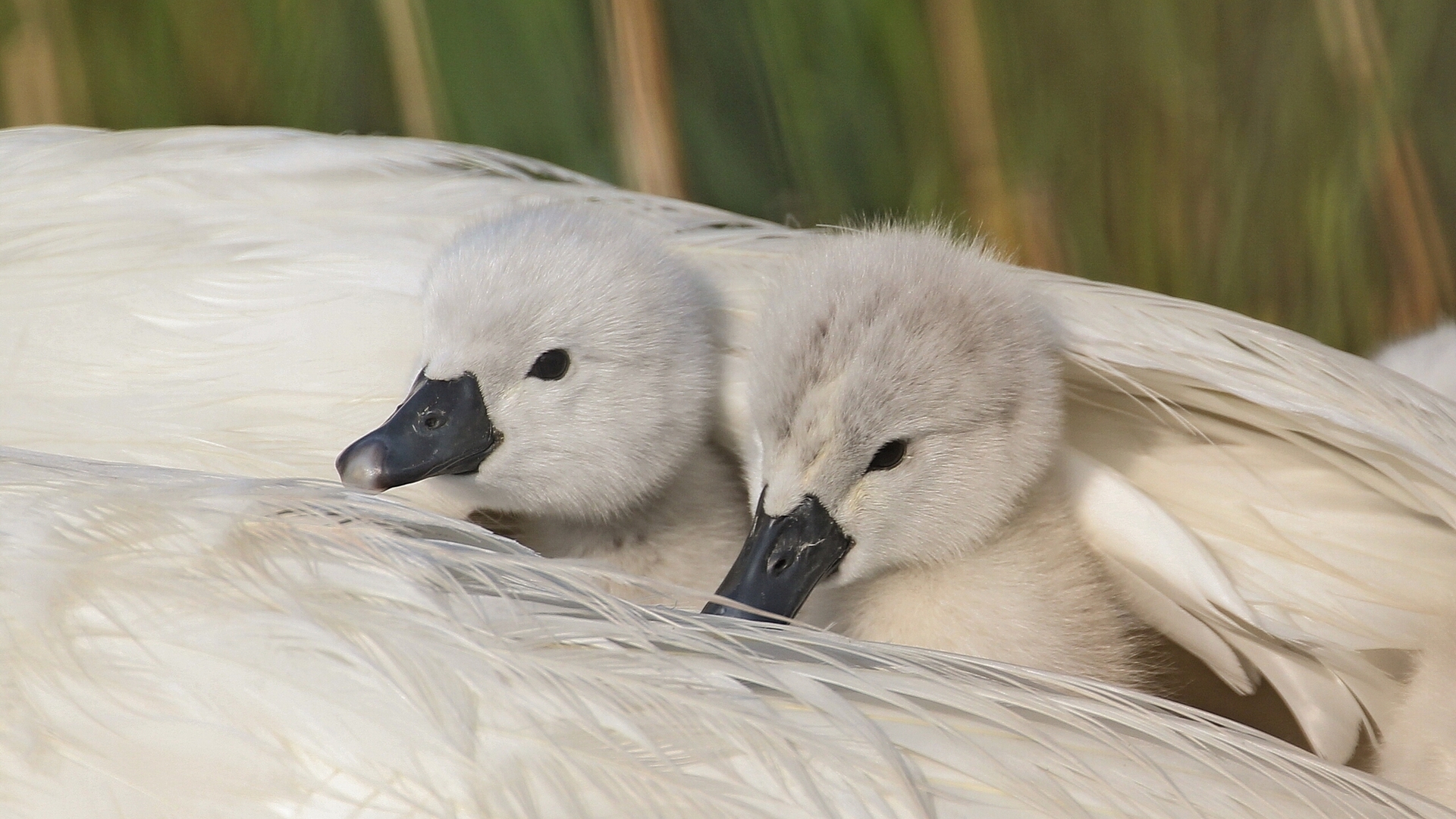 Description: Two white birds with black beaks are sitting together on the grass and grass behind them are tall grass.