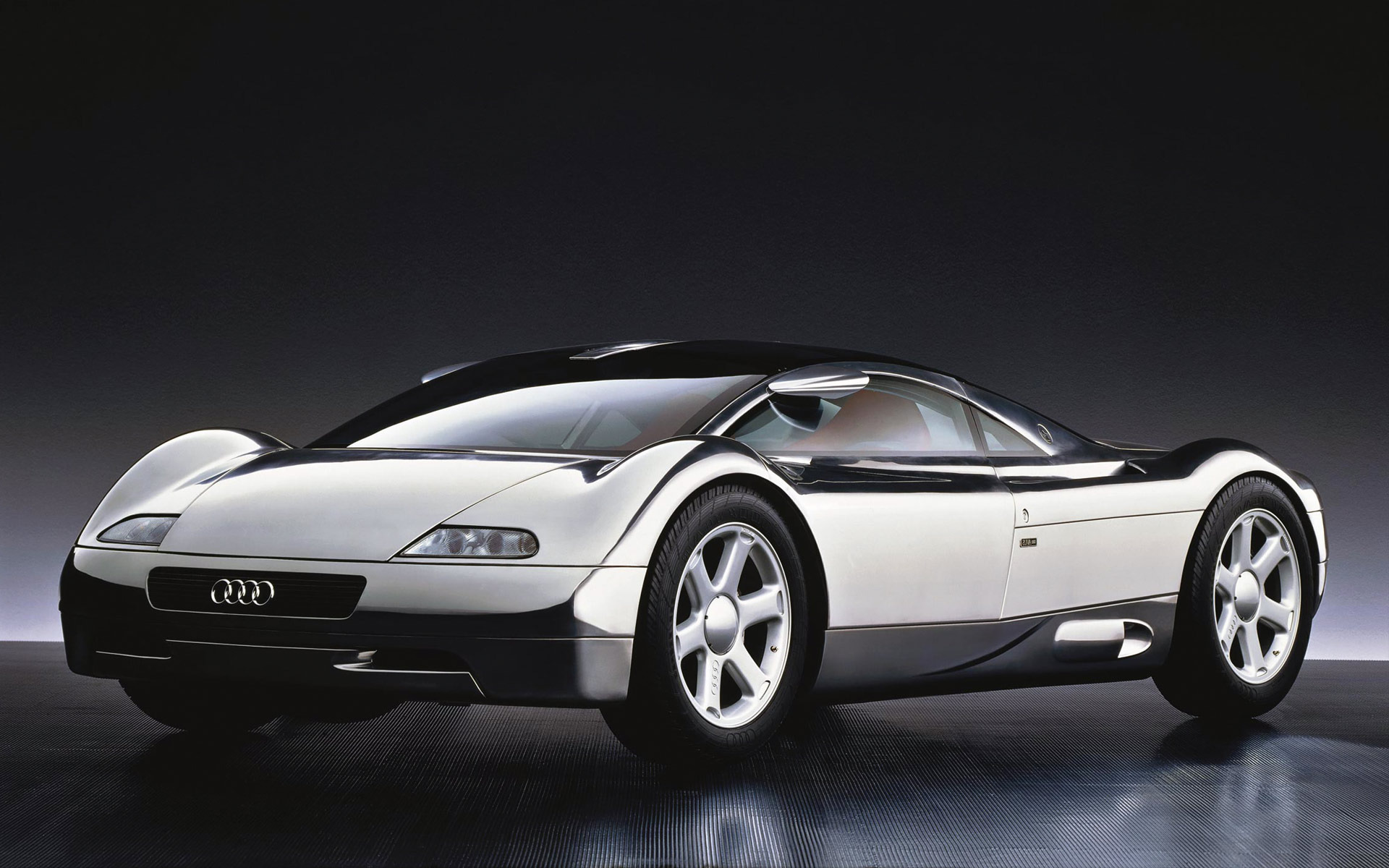 Description: A white and black car on a black floor in a room with a black background and a black backdrop.