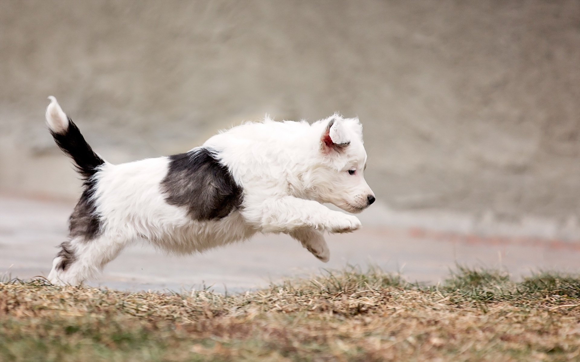 Description: A small white and black dog running on a field of grass and dirt with a wall in the background.
