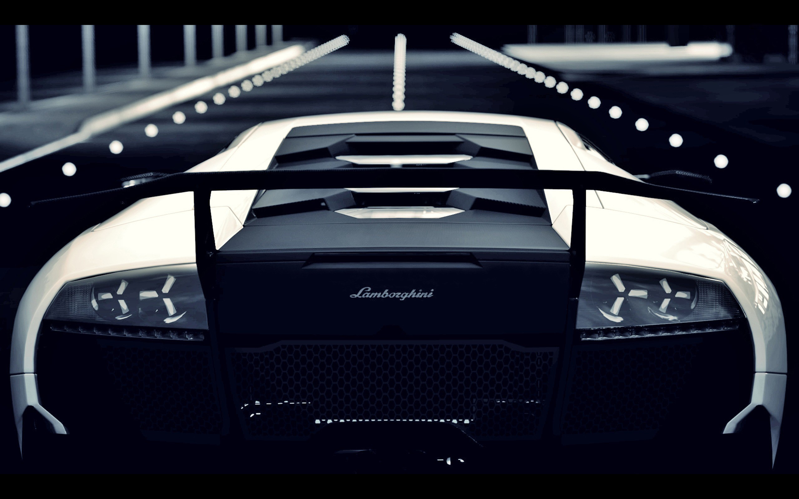 Description: A white and black sports car driving down a street at night time with lights on the side of it.