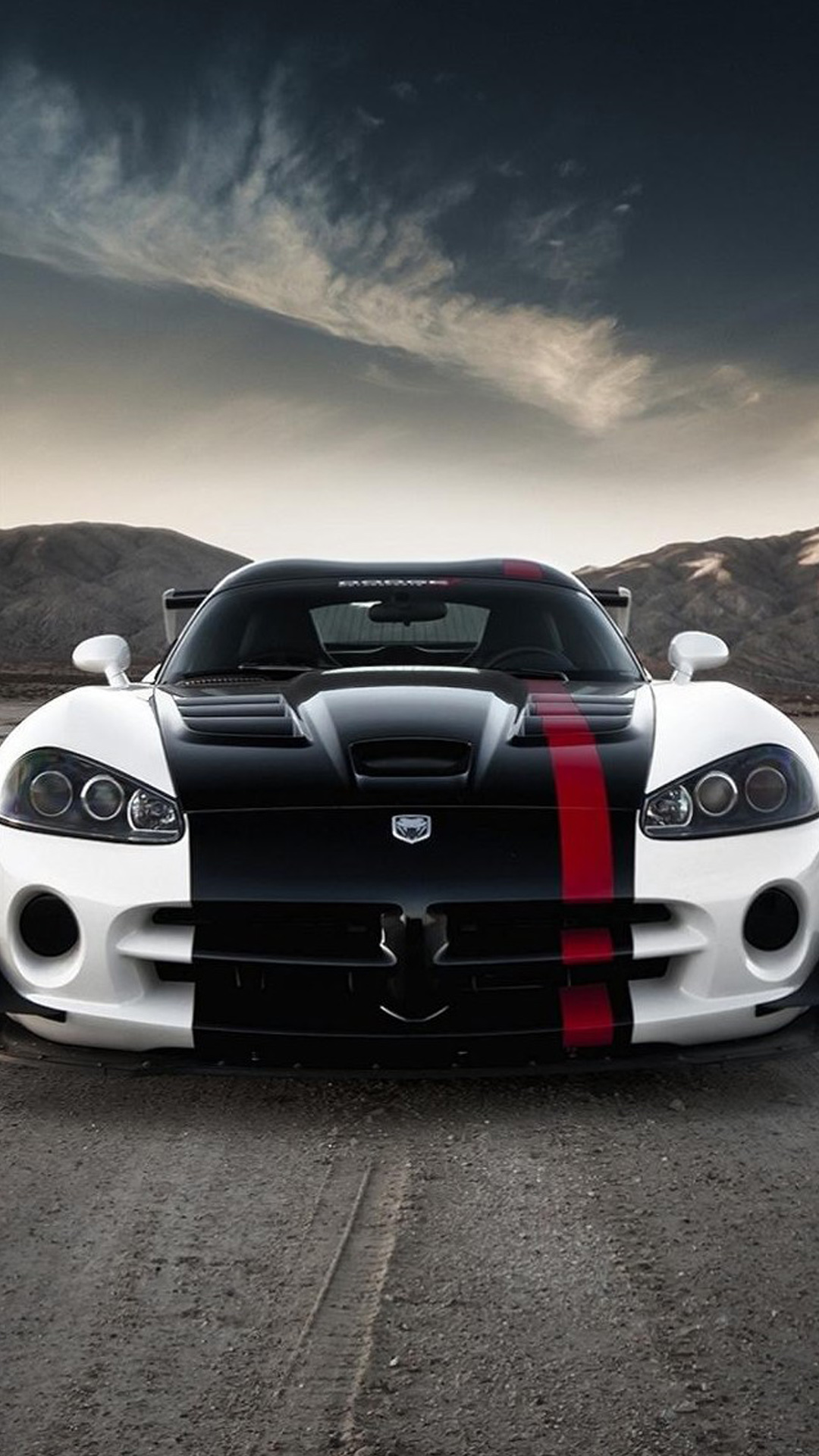 Description: A white and black sports car parked in a parking lot with a red stripe on the front of it.