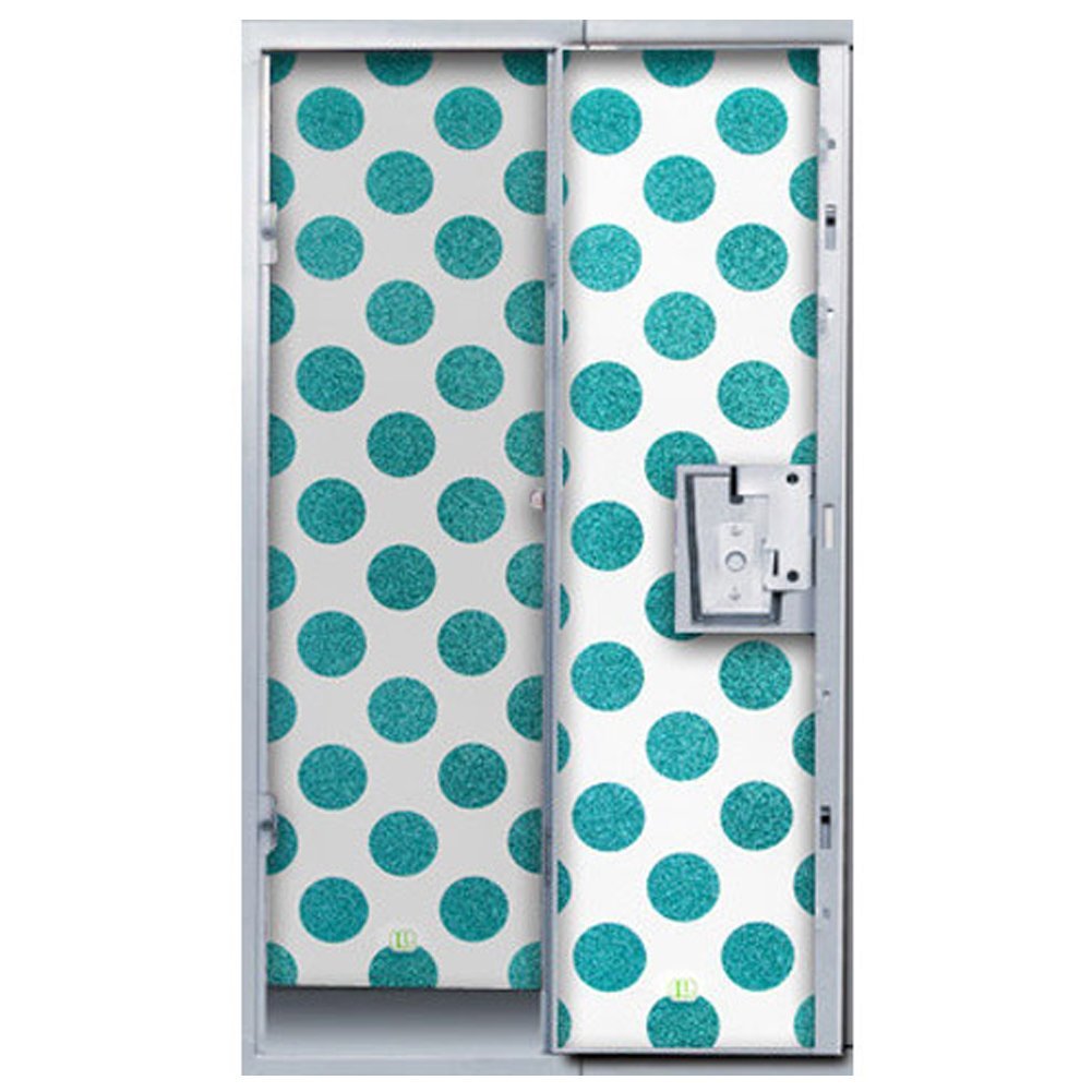 Description: A white and blue locker with a green polka dot pattern on it's door and a light switch.