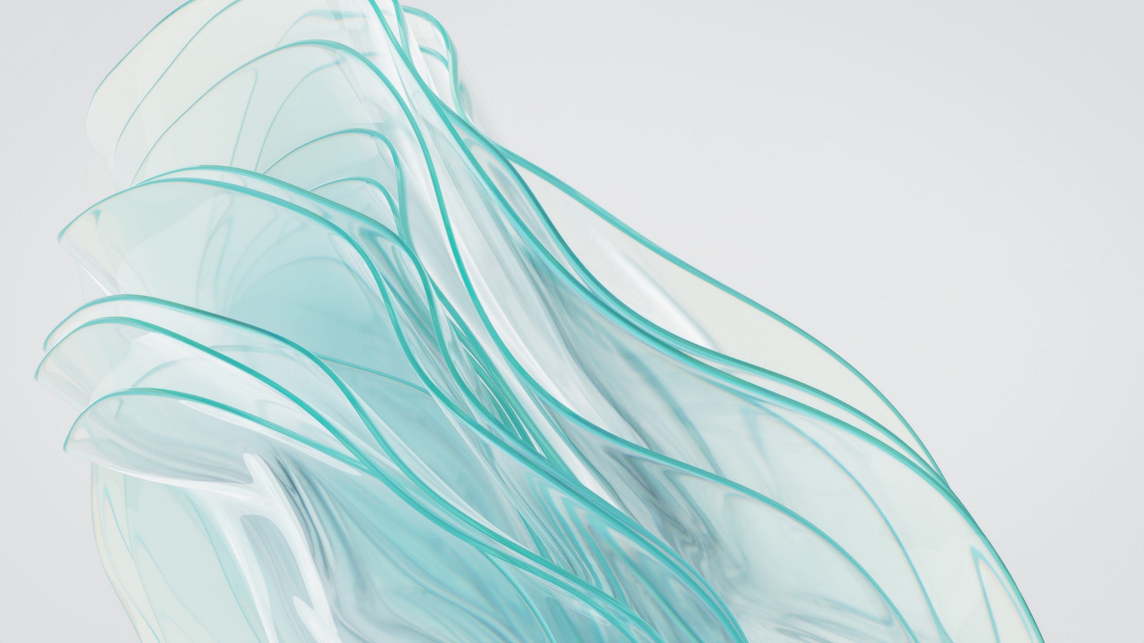 Description: A white and blue vase with a long green streamer in it's center and a white background.