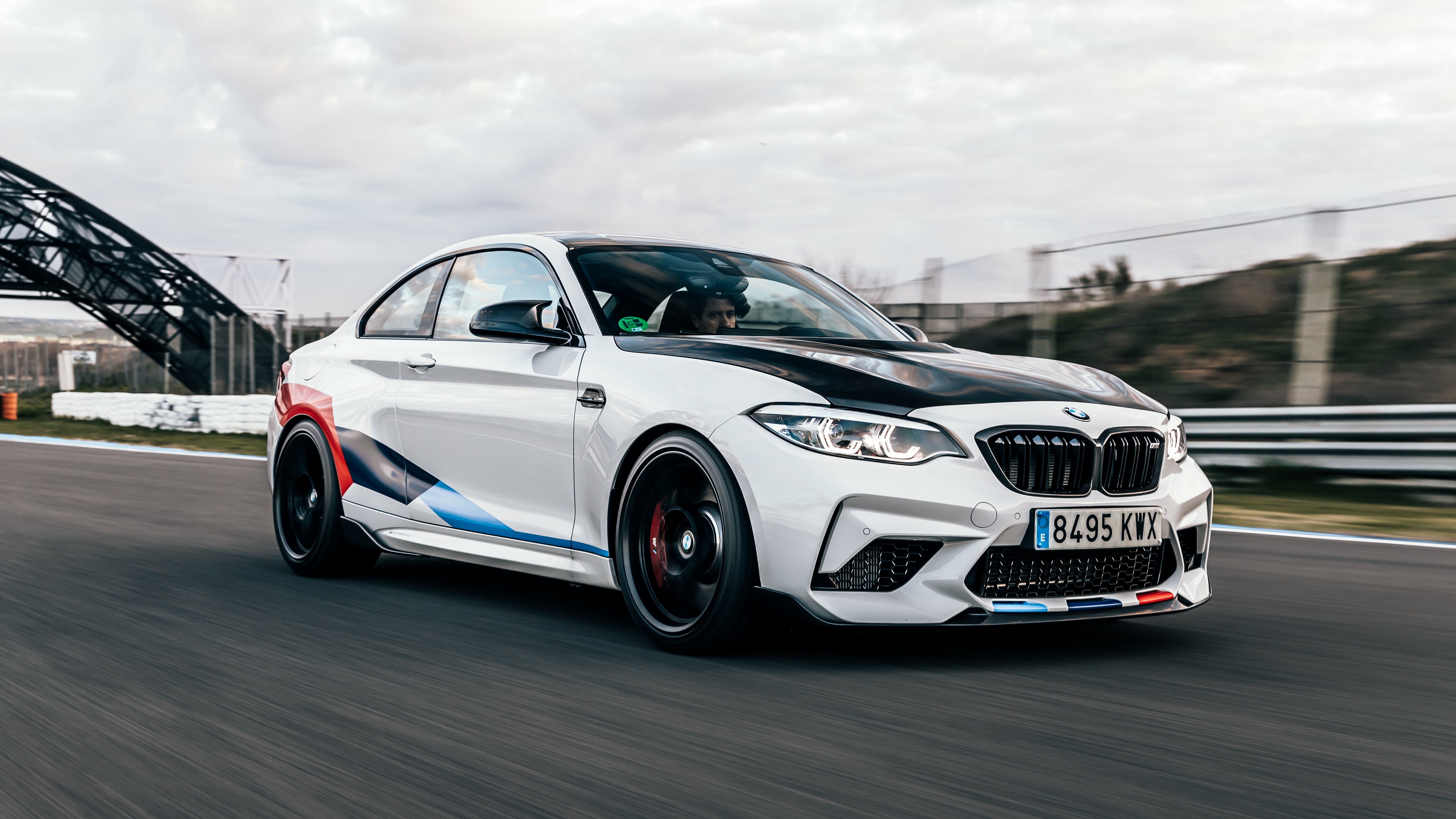 Description: A white bmw car driving down a road next to a bridge and a bridge in the background with a sky background.