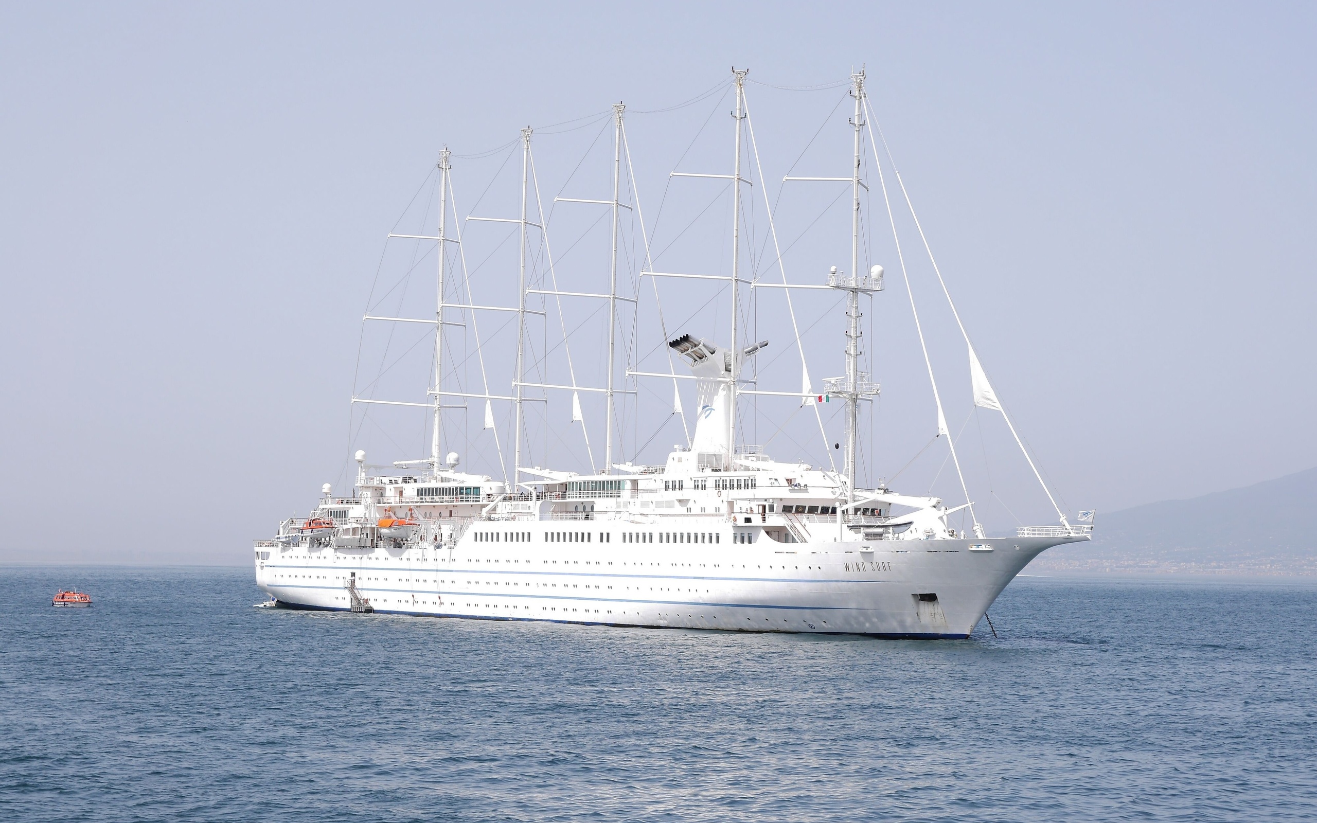 Description: A large white boat floating on top of a body of water next to a mountain range in the distance.