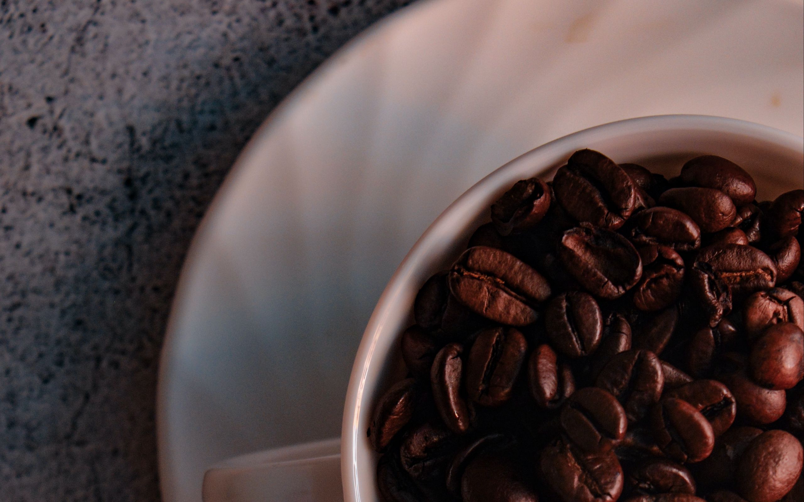 Description: A white bowl filled with coffee beans on top of a table next to a cup of coffee on a saucer.