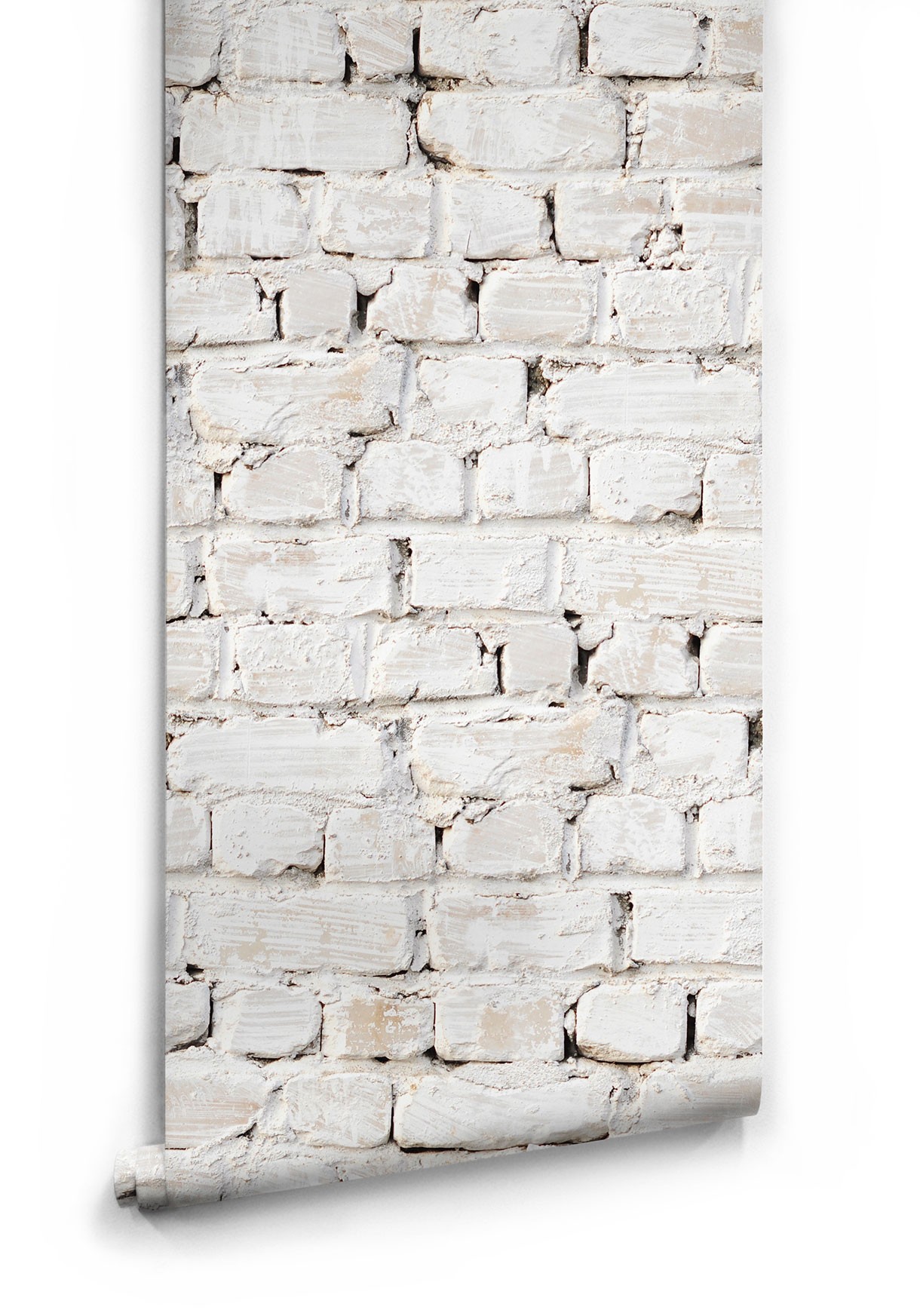 Description: A white brick wall with a white background and a white wallpaper border with a white brick wall pattern.