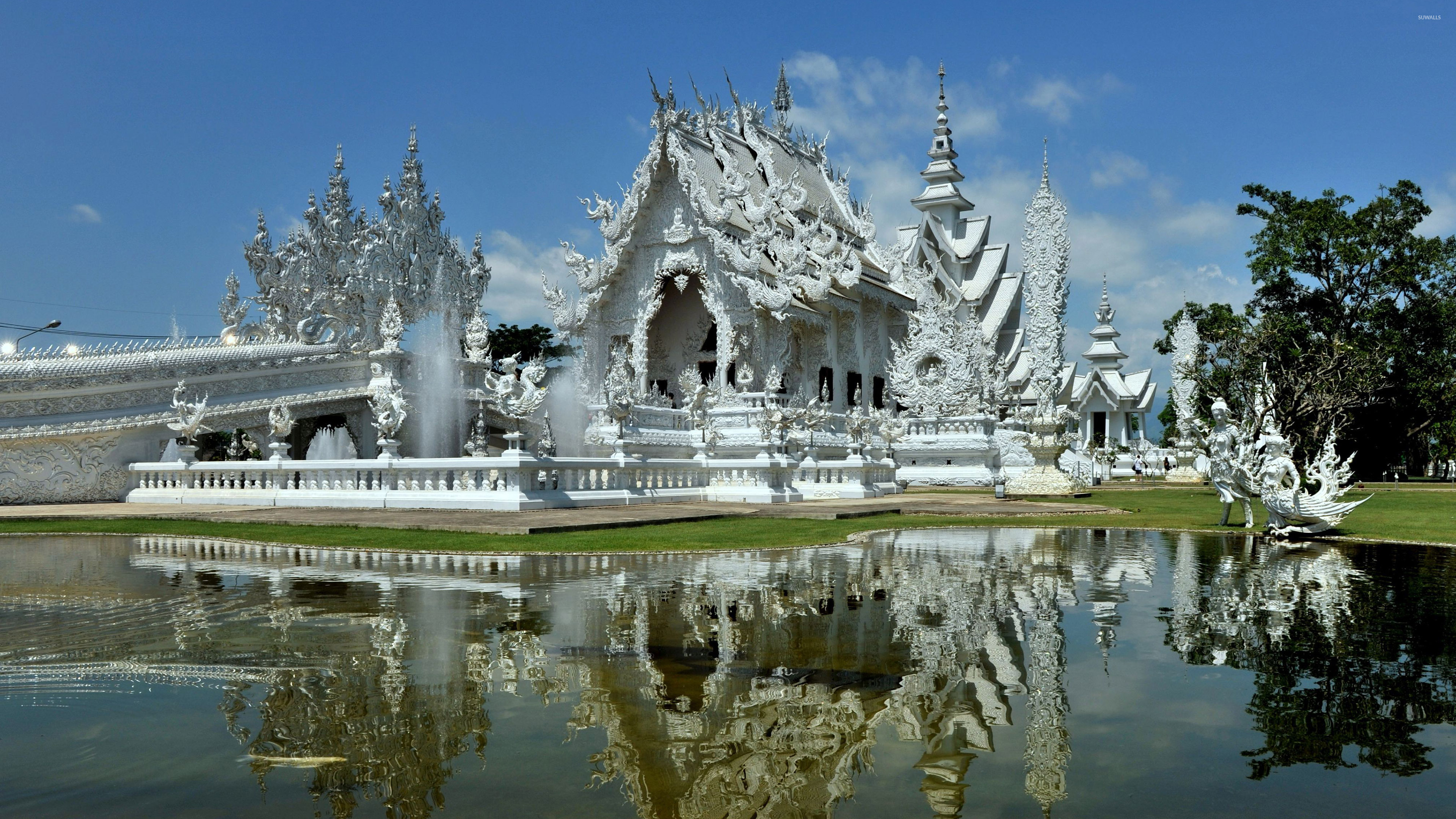 Description: A white building with a pond in front of it and a sky background with clouds in the background and a reflection in the water.