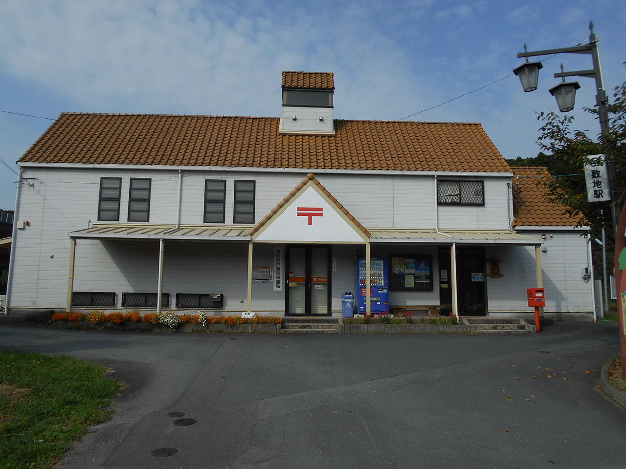 Description: A white building with a red cross on the front of it and a red light on the side of the street.