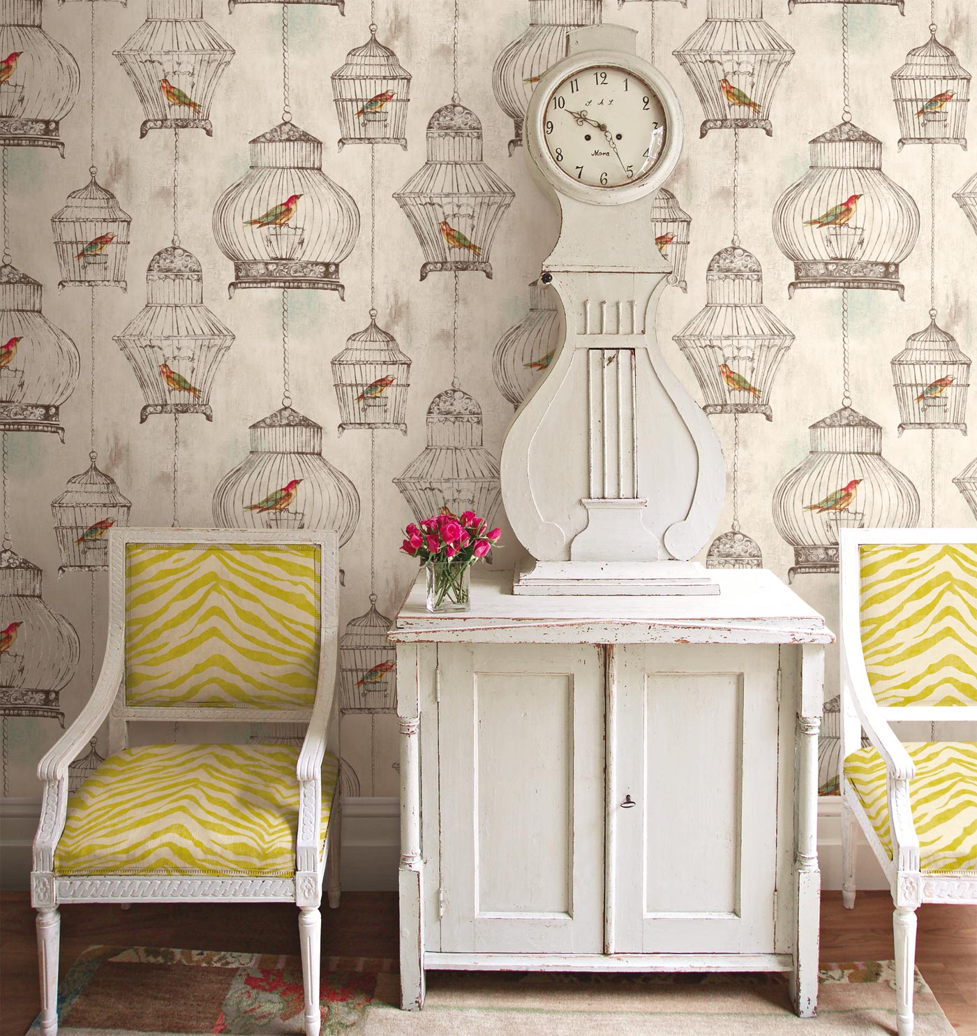 Description: A white cabinet sitting next to a white clock on a wall next to a chair and a table with a vase of flowers.