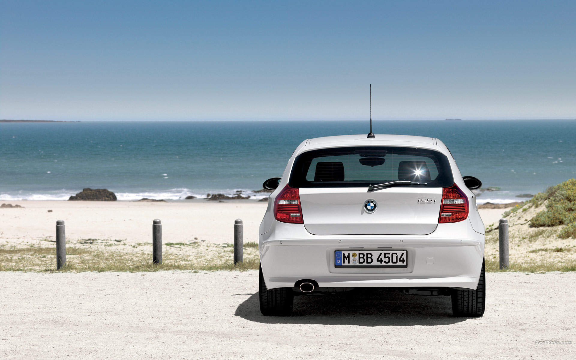 Description: A white car parked on the beach near the ocean and a fenced in area with a beach in the background.