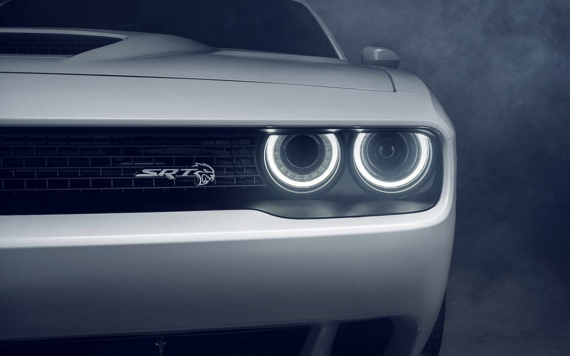 Description: A white car with a black hood and lights on it's headlight and fog behind it and a black background.
