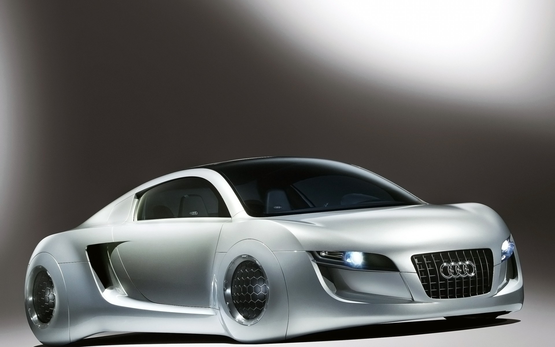 Description: A white car with a black top and a light on it's side and a gray background behind it.
