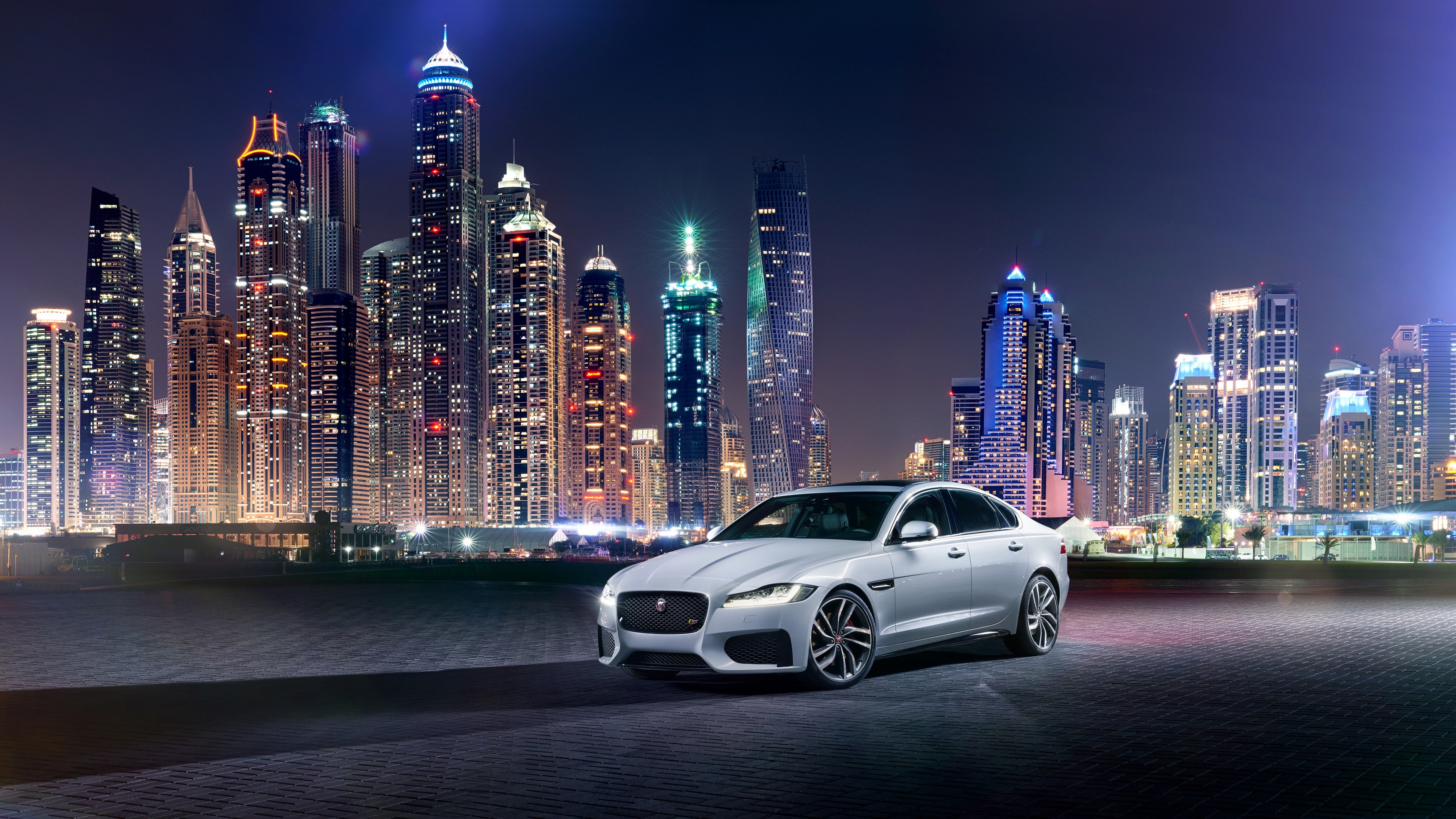Description: A white car parked in front of a city skyline at night with lights on it's buildings and a city skyline.