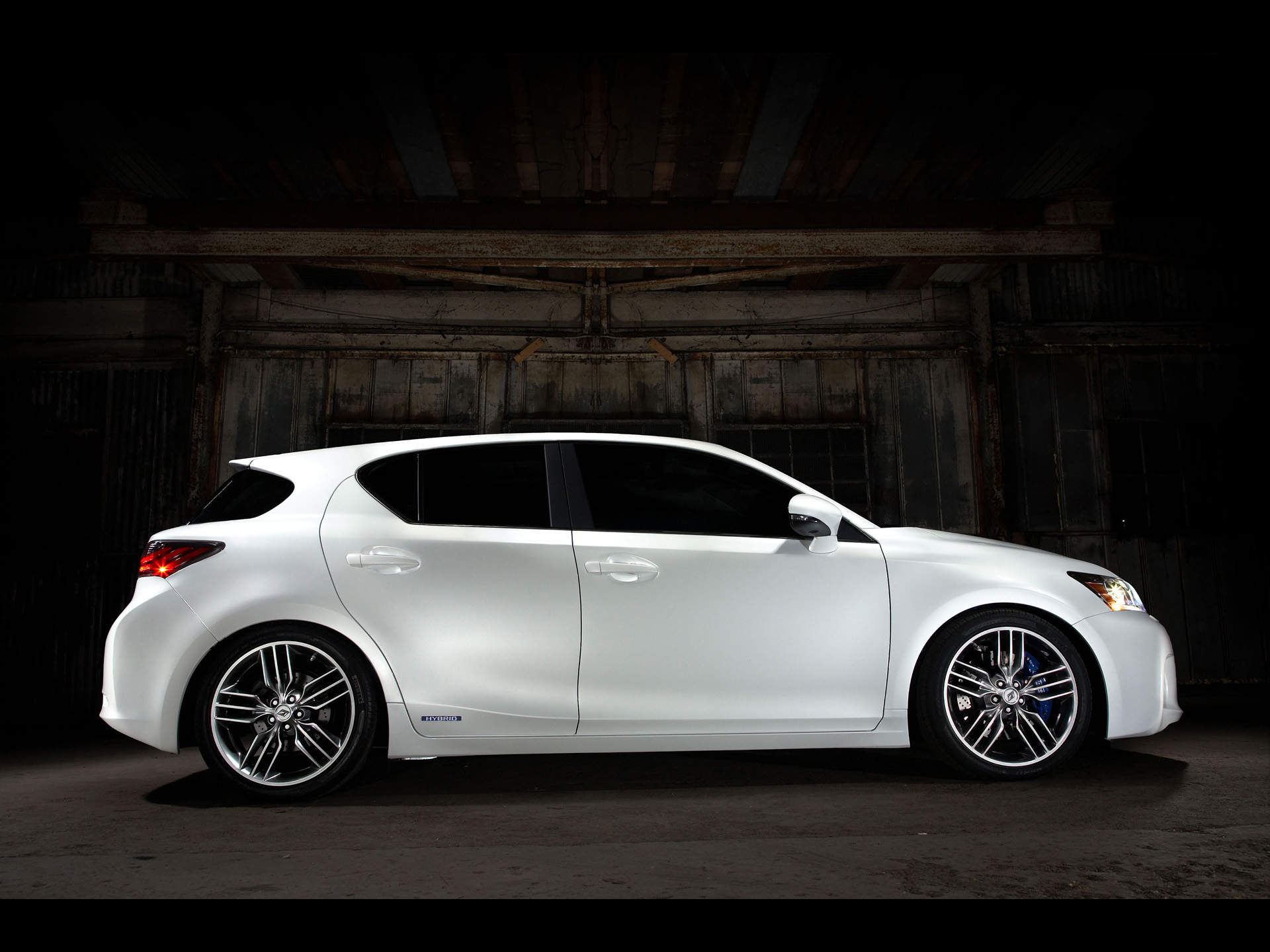 Description: A white car parked in a dark garage area with a door open and a black background behind it and a black door.