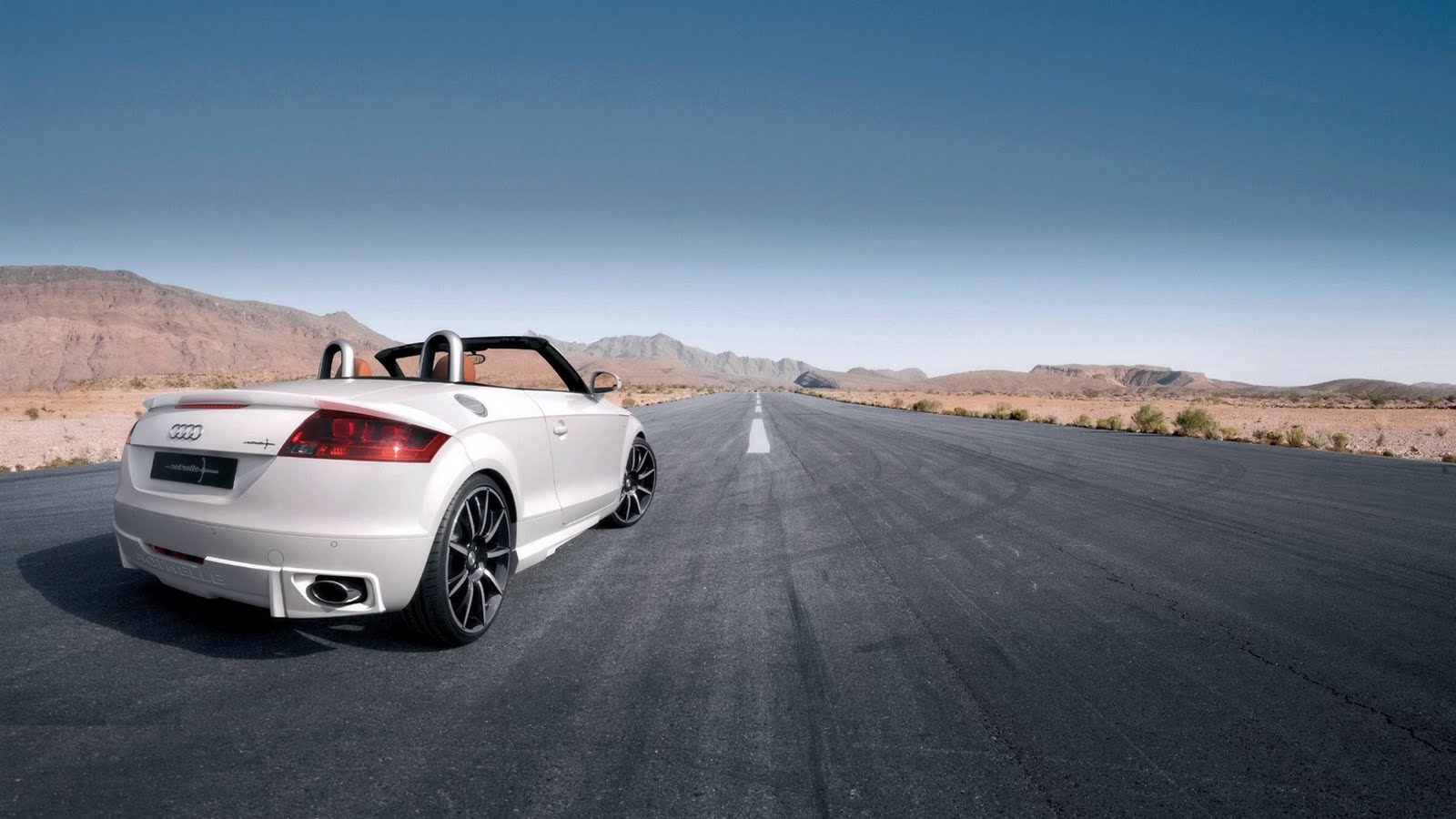 Description: A white car is parked on the side of the road in the desert with a sky background and a mountain range.
