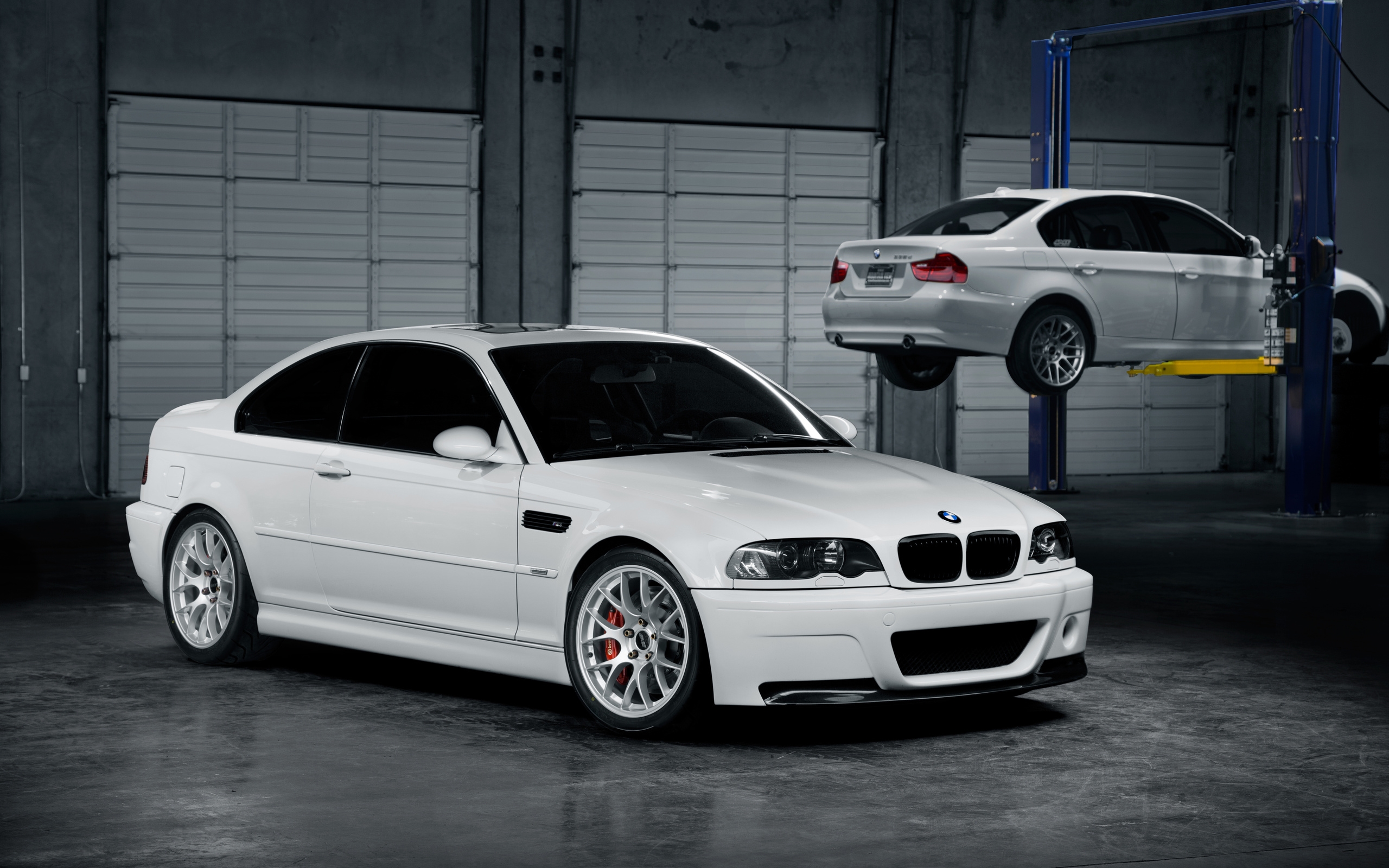 Description: A white car is parked in a garage with a white car on a lift behind it and another white car is parked in the garage.