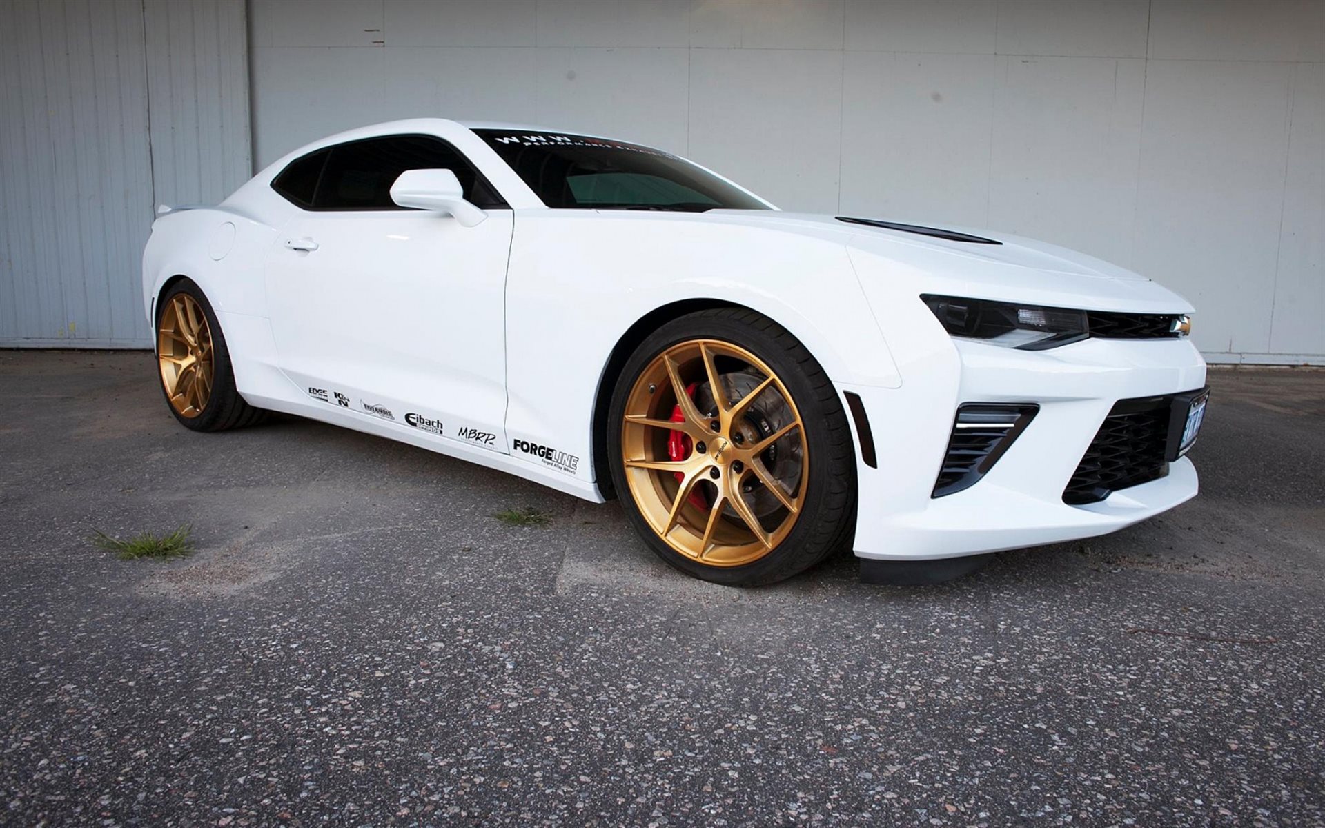 Description: A white car with gold rims parked in a garage area with a white wall behind it and a white garage door.