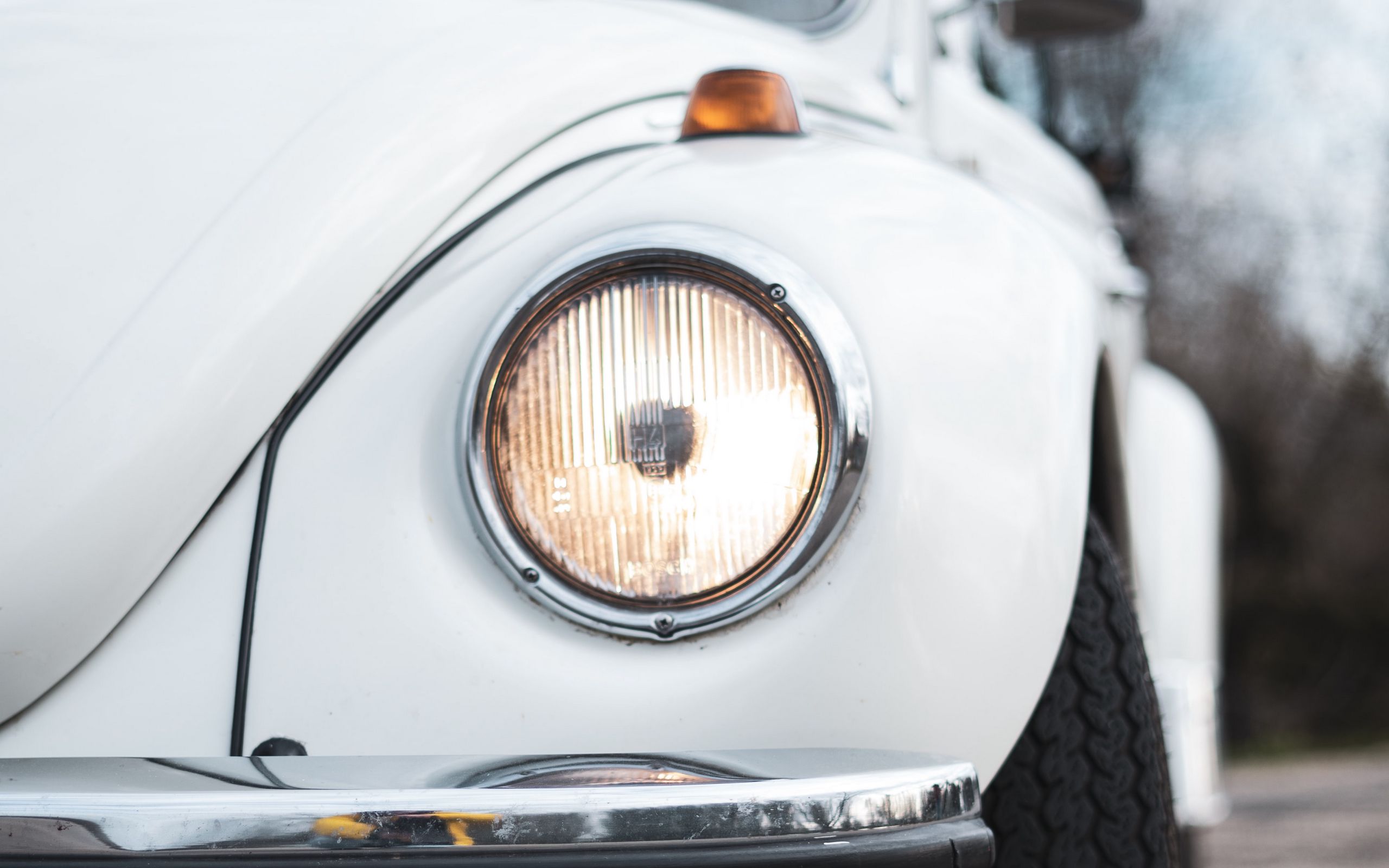Description: A close up of a white car with a light on it's headlight and a black tire.