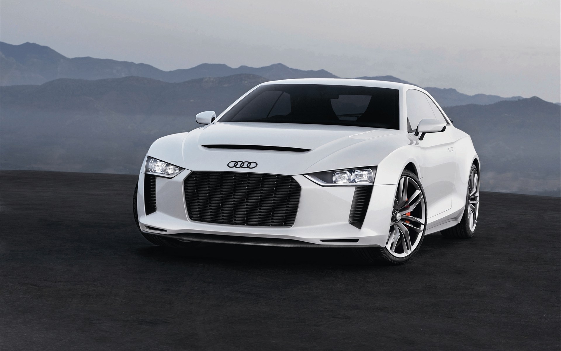Description: A white car parked in a parking lot with mountains in the background and a cloudy sky above it.