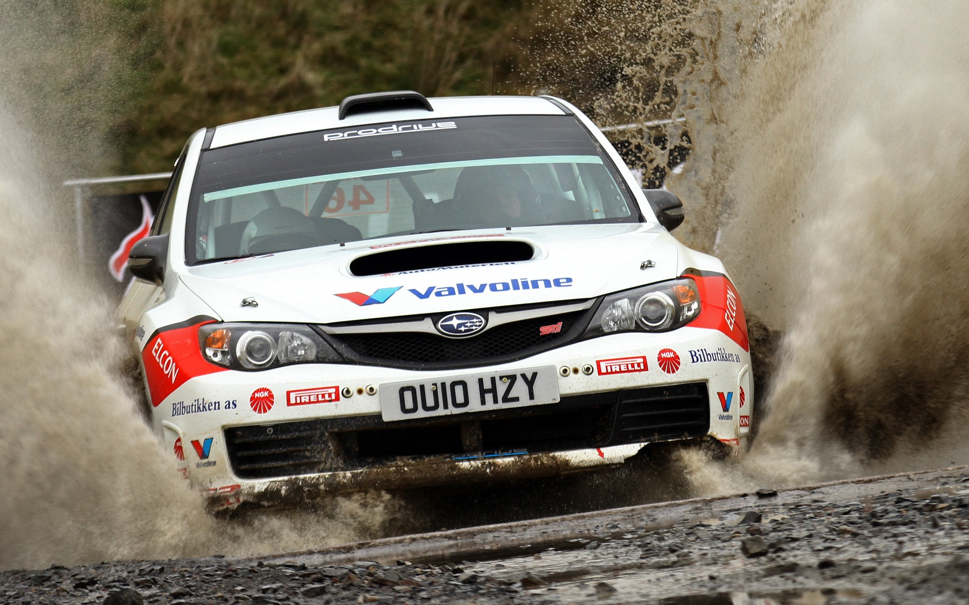 Description: A white car driving through a muddy road next to a forest of trees and rocks on a dirt road.
