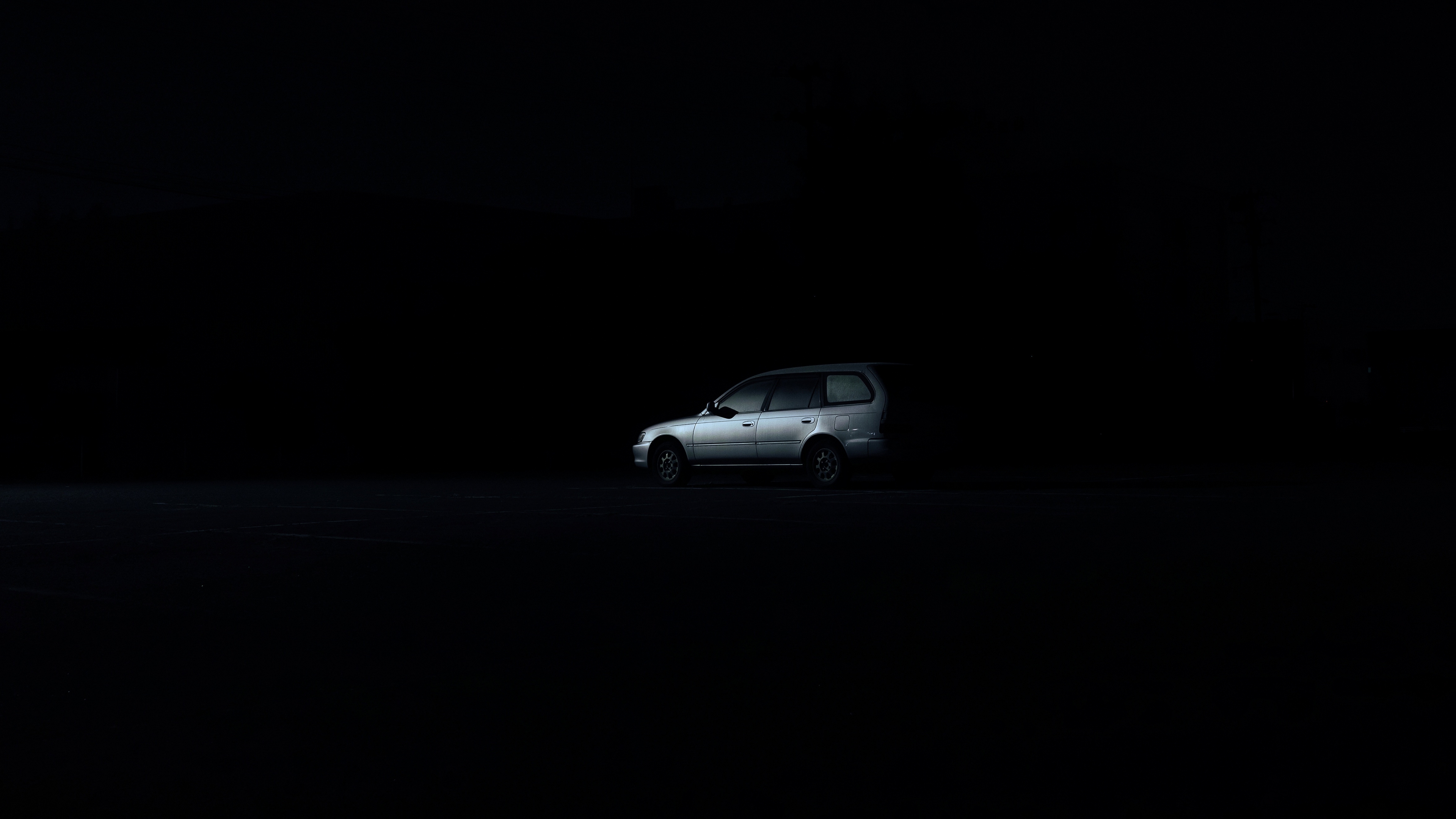 Description: A white car parked in a dark parking lot at night time with the headlights on and the door open.