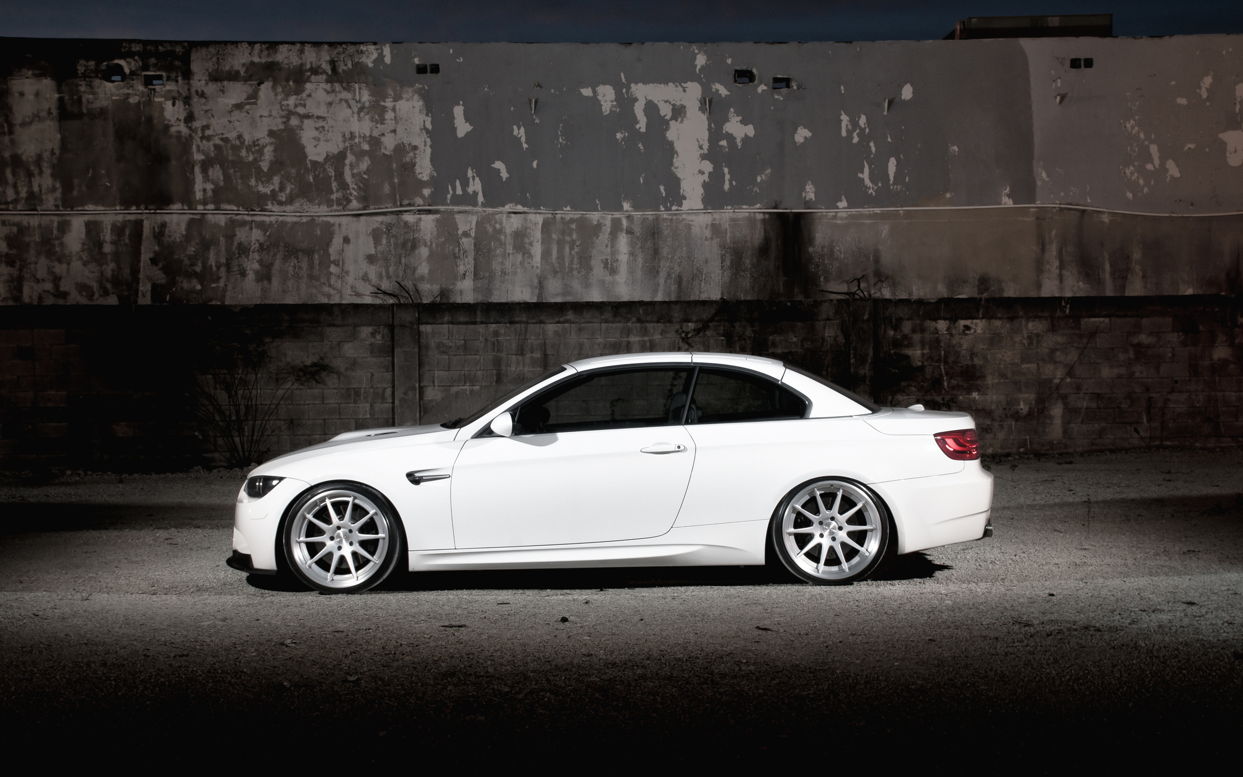 Description: A white car parked in a parking lot at night time with a concrete wall behind it and a dark sky.