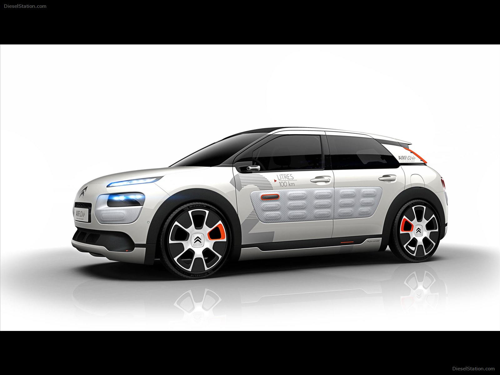 Description: A white car with orange rims and a white background with a reflection of the car on the floor.