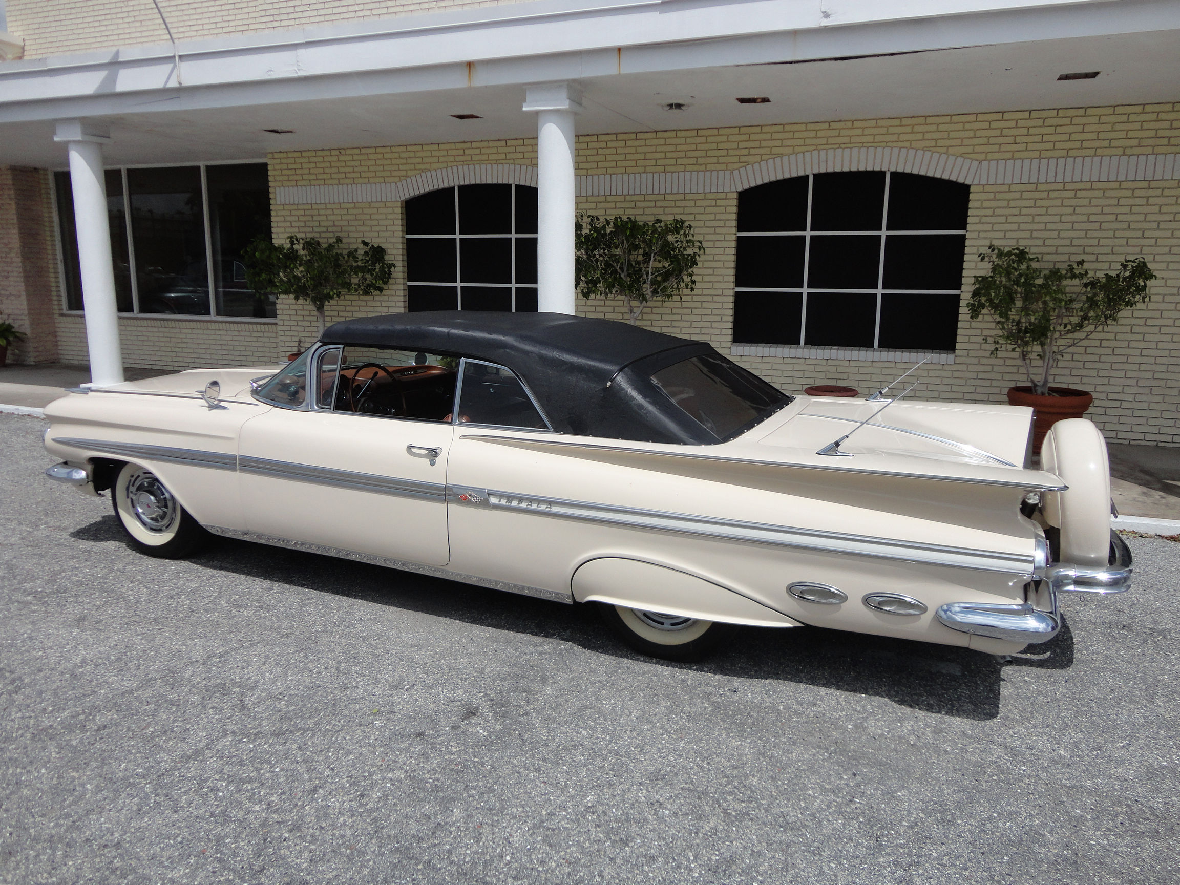 Description: A white car parked in front of a building with a black top and a black top on it's hood.