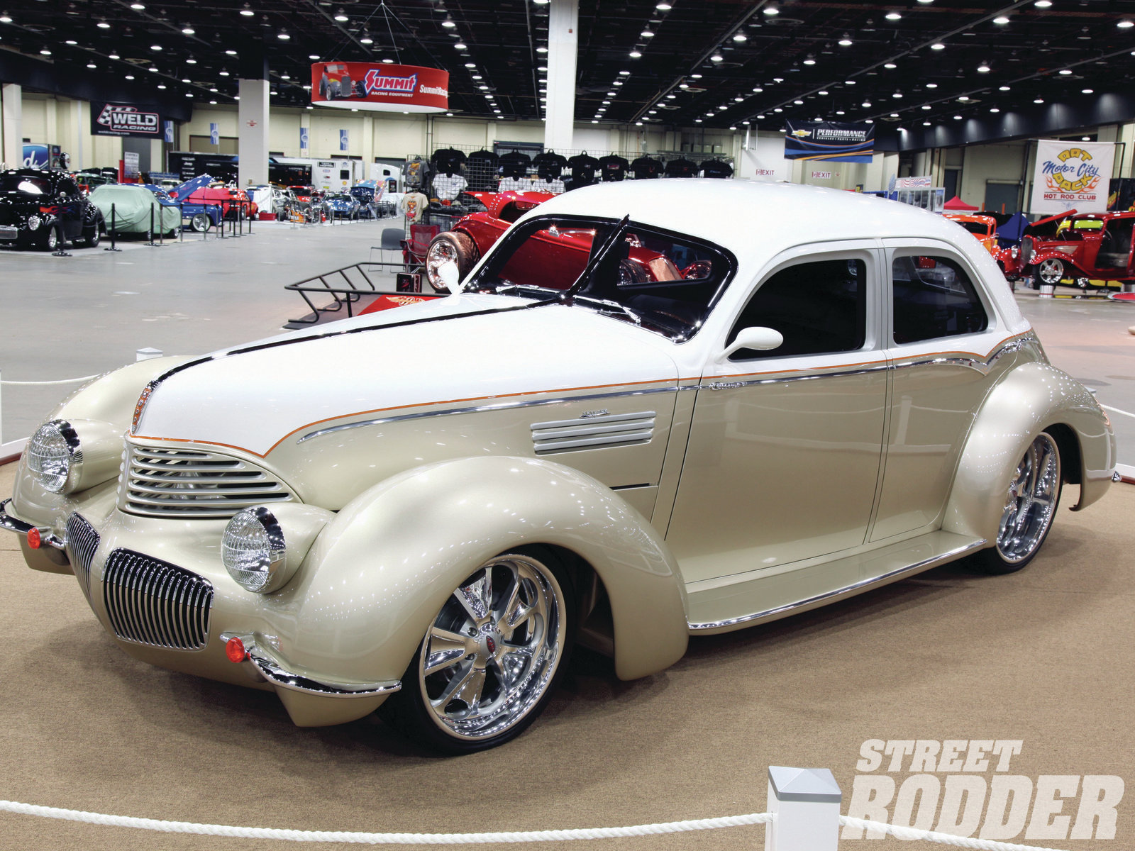 Description: A white car parked inside of a building next to a crowd of people and a sign that says street rodder.