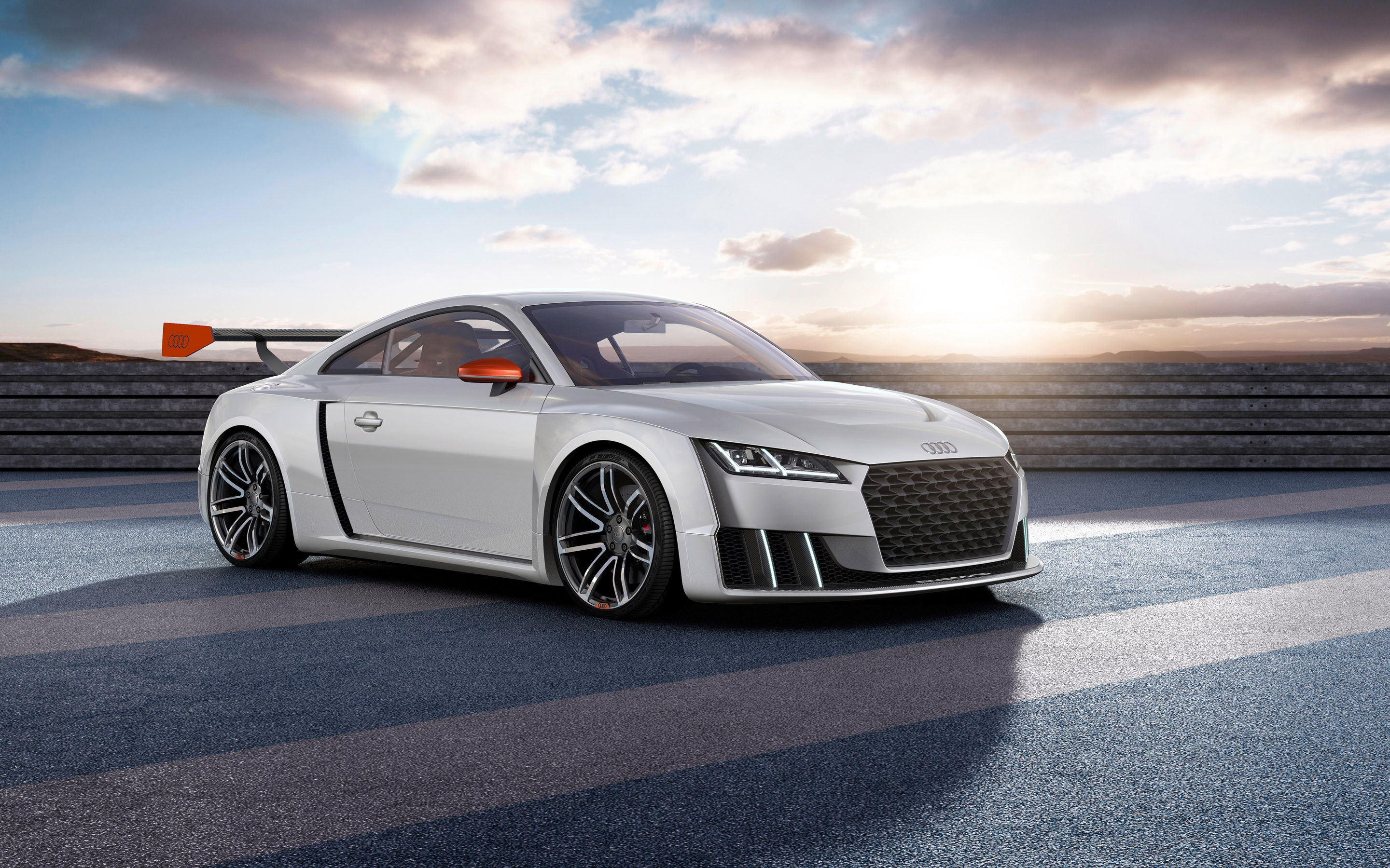 Description: A white car parked on a road with a sky background and clouds in the background and a red light on the front.