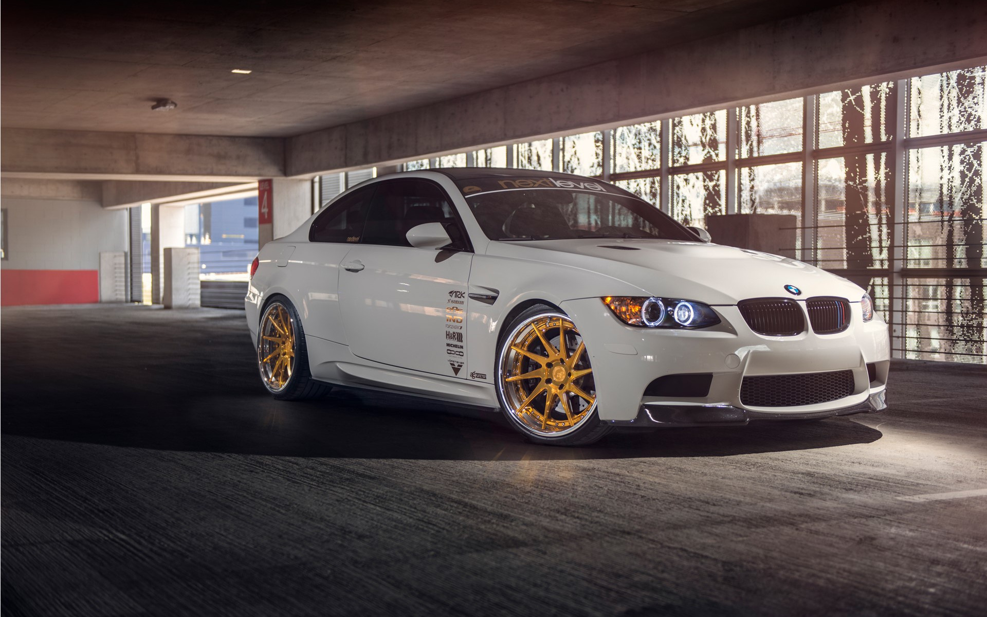 Description: A white car parked in a parking garage next to a window with a lot of windows behind it and a yellow rim.