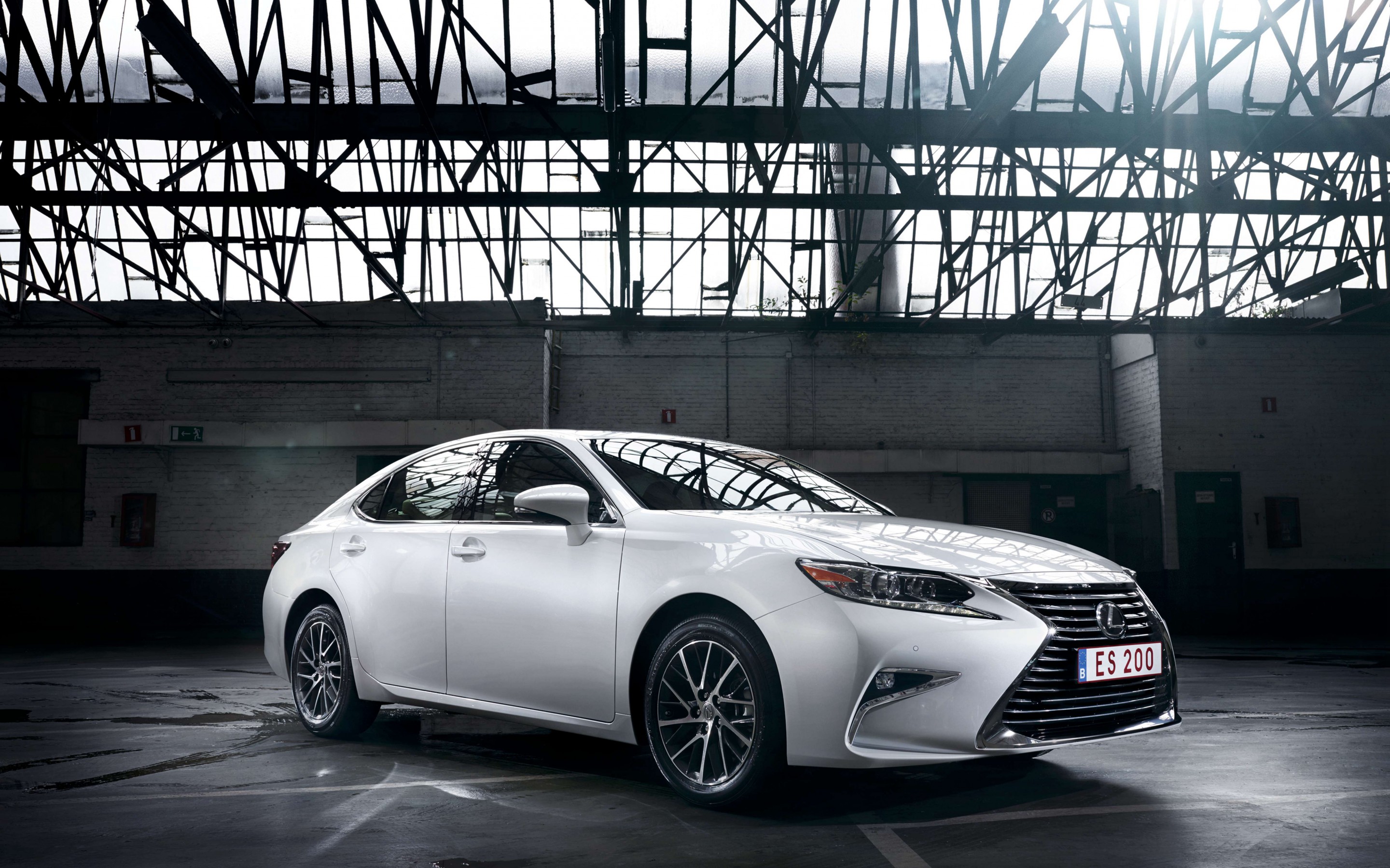 Description: A white car parked in a parking lot next to a building with a large window on the side of it.