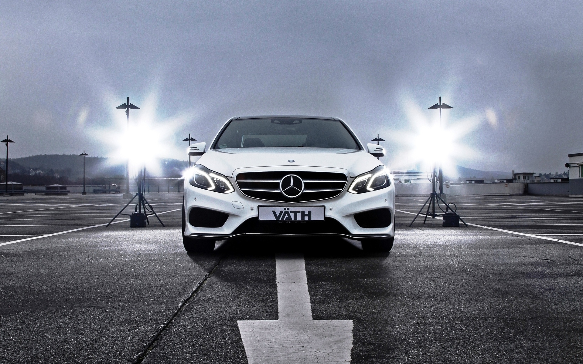 Description: A white car parked in a parking lot with lights on it's sides and a white arrow in the middle of the road.