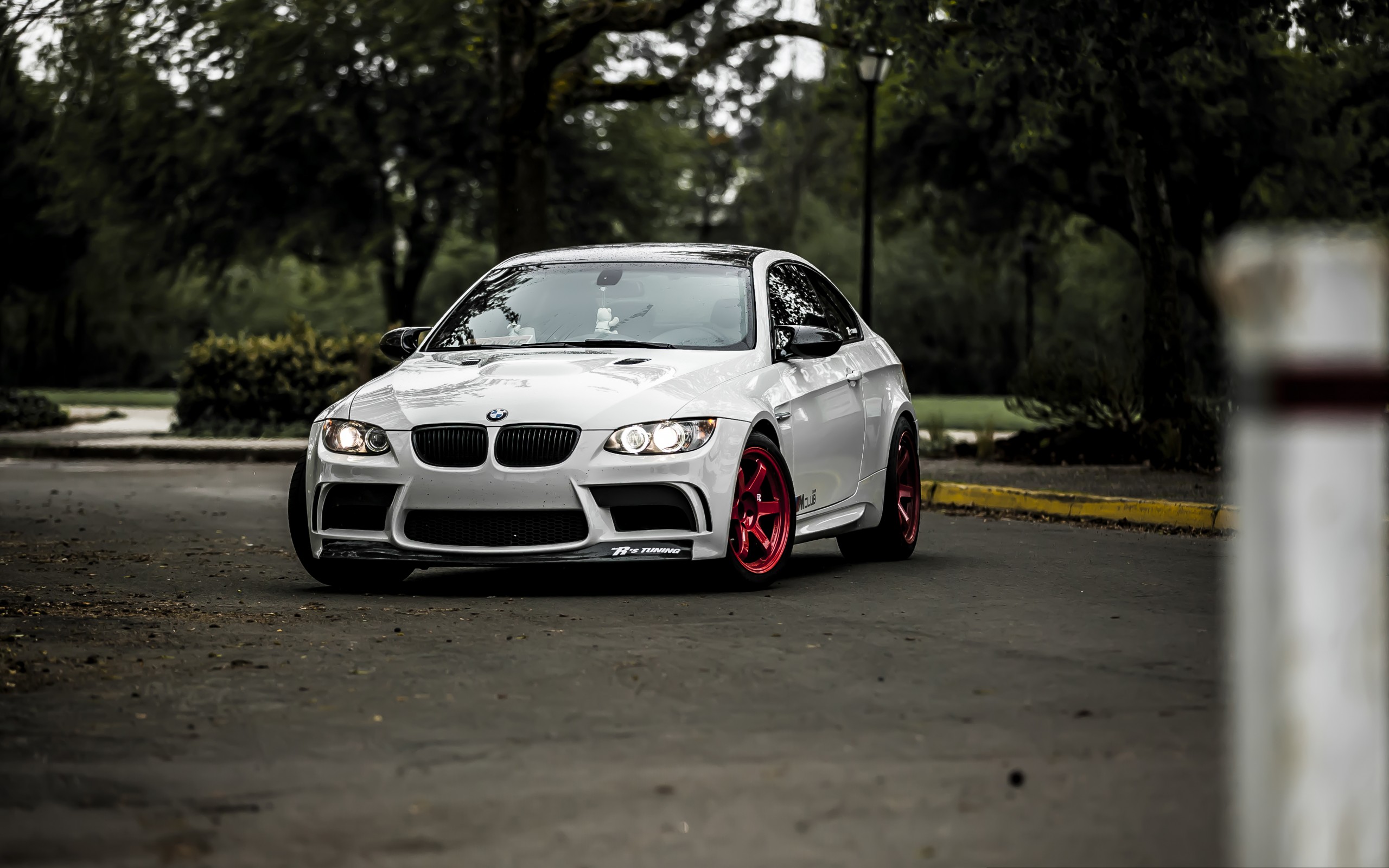 Description: A white car parked in a parking lot next to trees and bushes with red rims on it's tires.