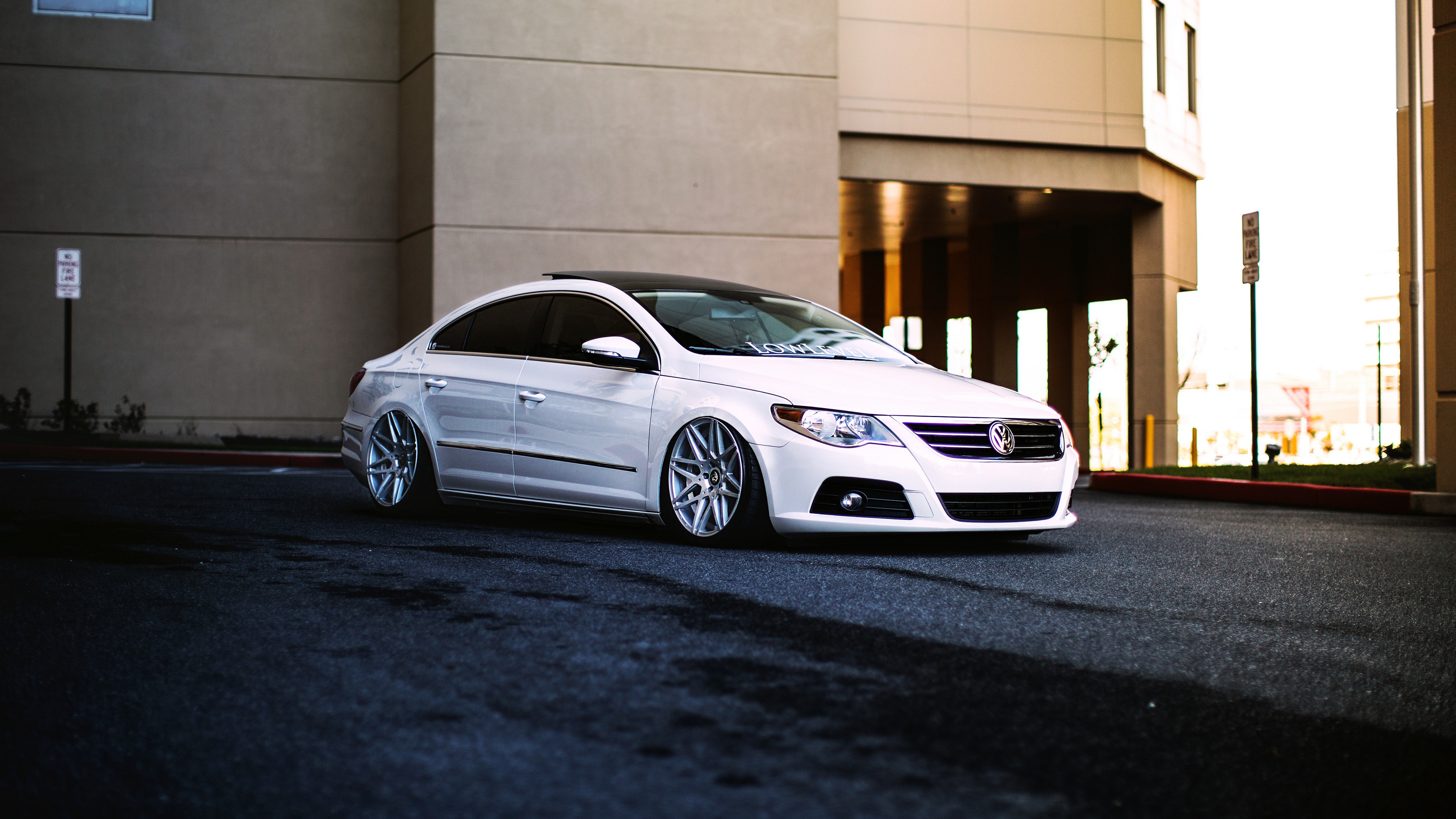 Description: A white car parked on the side of a road next to a building with a parking meter on it.