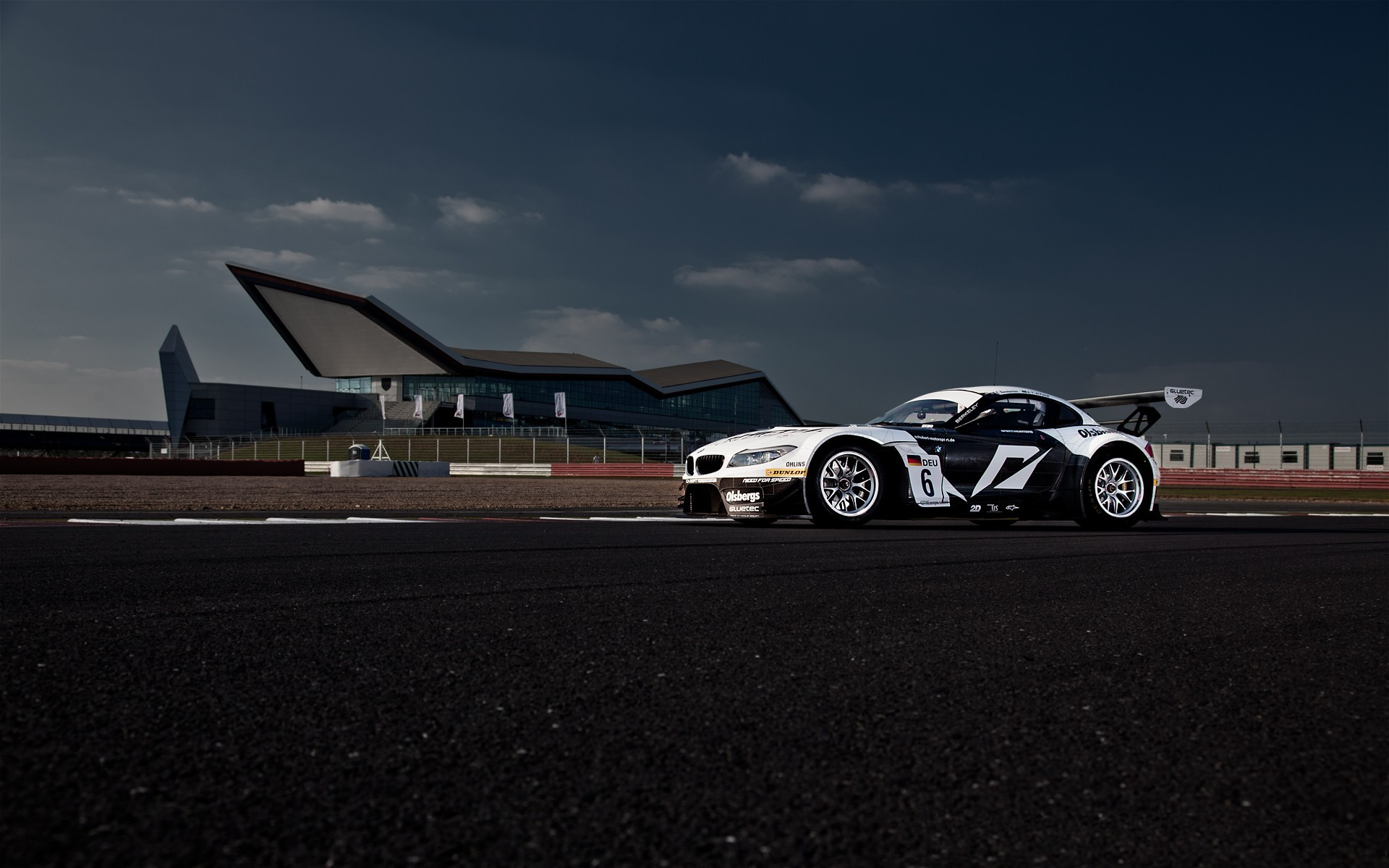 Description: A white car driving down a race track next to a building with a sky background and a wing of a plane.