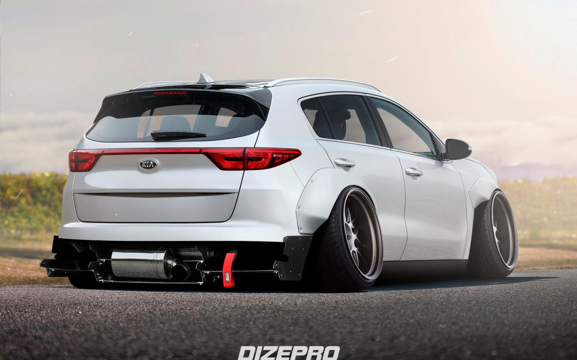 Description: A white car parked on the side of a road next to a field of grass and trees with a sky background.