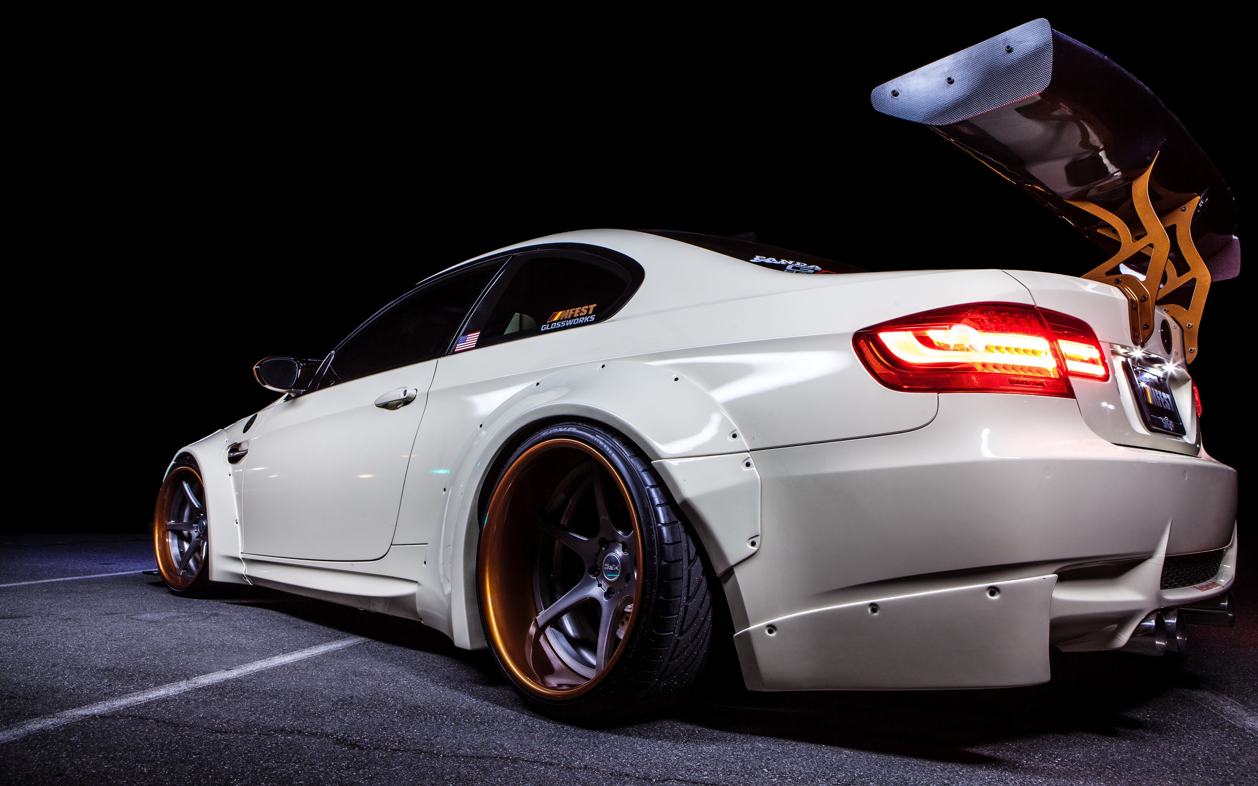 Description: A white car with its trunk open in a parking lot at night time with its hood up and the trunk of the car showing.