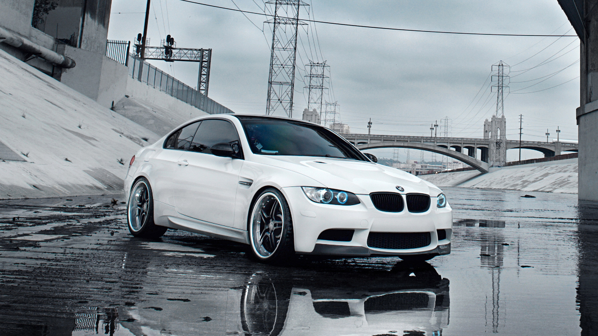 Description: A white car parked on a wet street next to a bridge and a bridge in the background with a sky background.