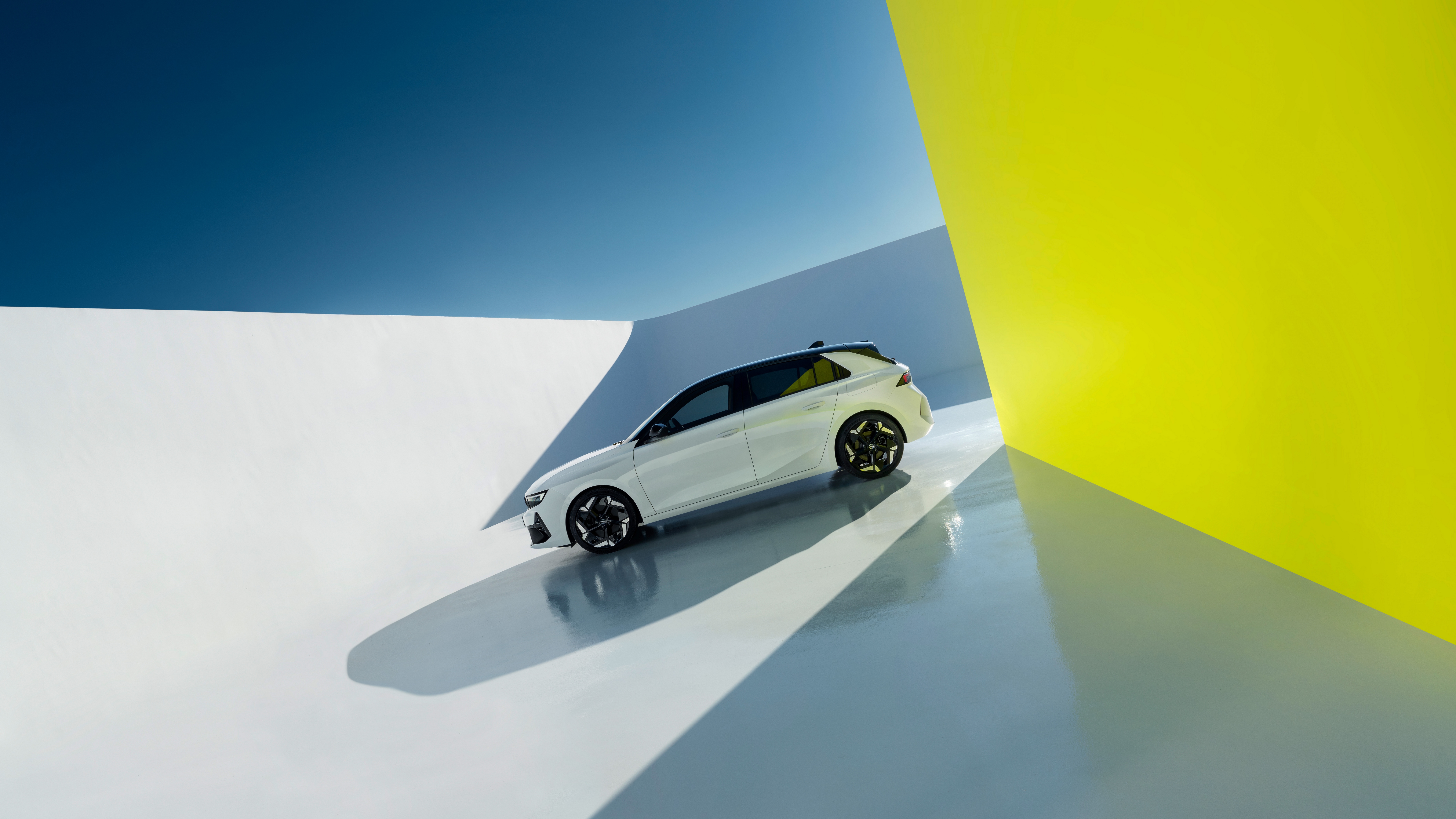 Description: A white car is parked in a white room with a yellow wall behind it and a blue sky behind it.