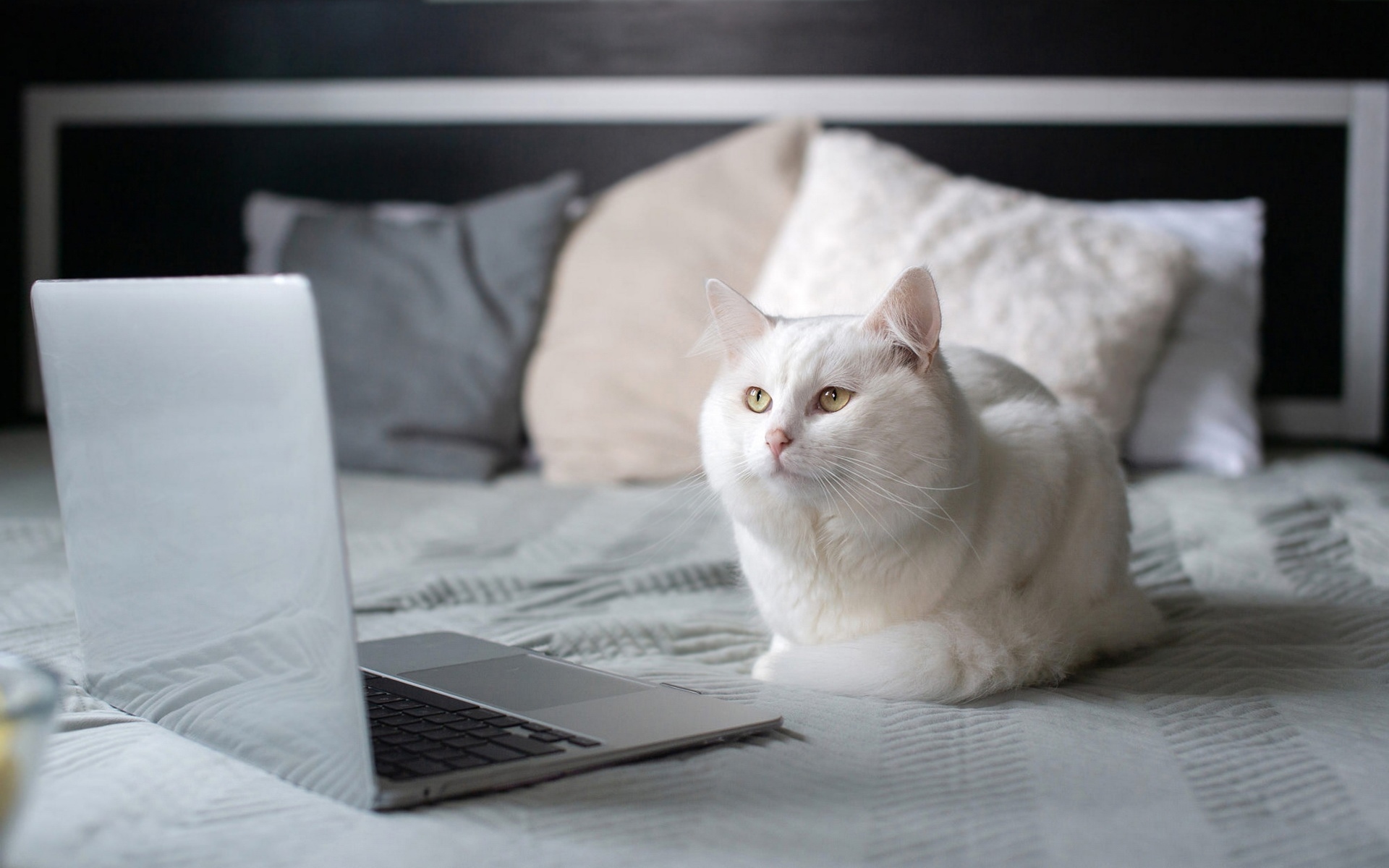 Description: A white cat sitting on a bed next to a laptop computer and a cup of coffee on a bed.