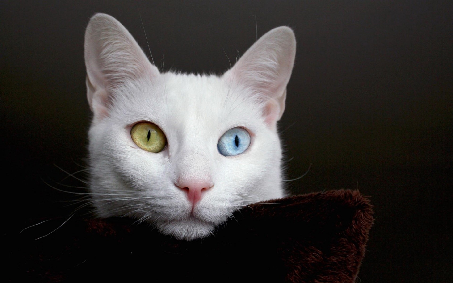 Description: A white cat with blue eyes and a brown blanket on a black background with a black background and a white cat with blue eyes.