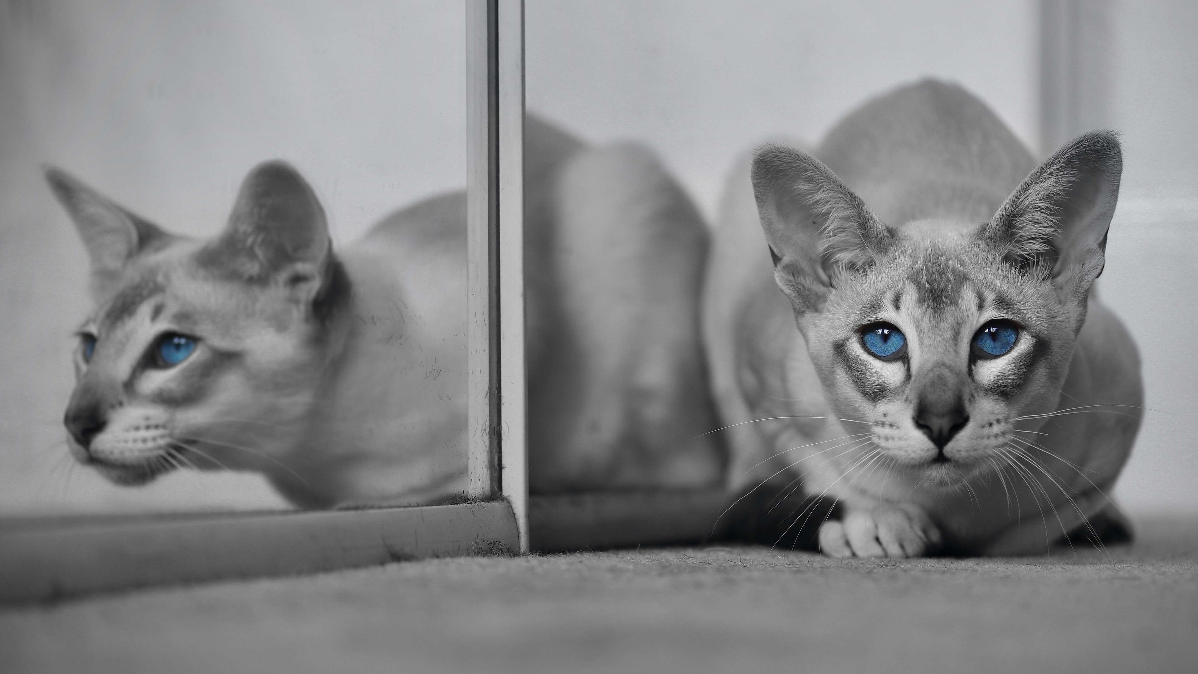 Description: A cat with blue eyes looking at itself in a mirror with a reflection of it's face in the mirror.