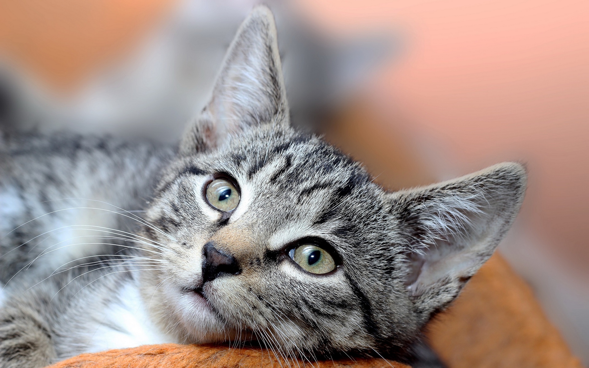 Description: A cat laying on top of a pillow looking up at the sky with its eyes wide open and a nose wide open.