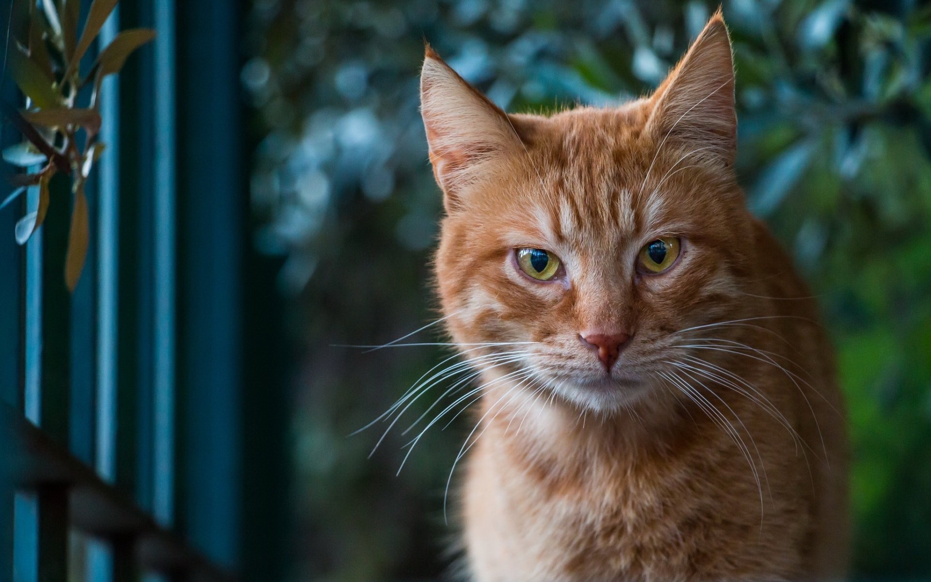 Description: A cat is looking out of a window with a green background and a tree in the background with leaves.