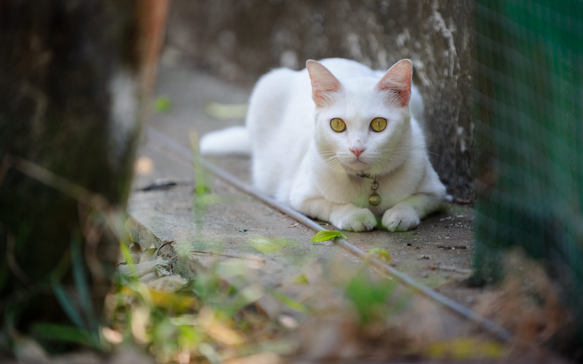Description: A white cat laying on the ground next to a fence and a tree trunk with green leaves on it.